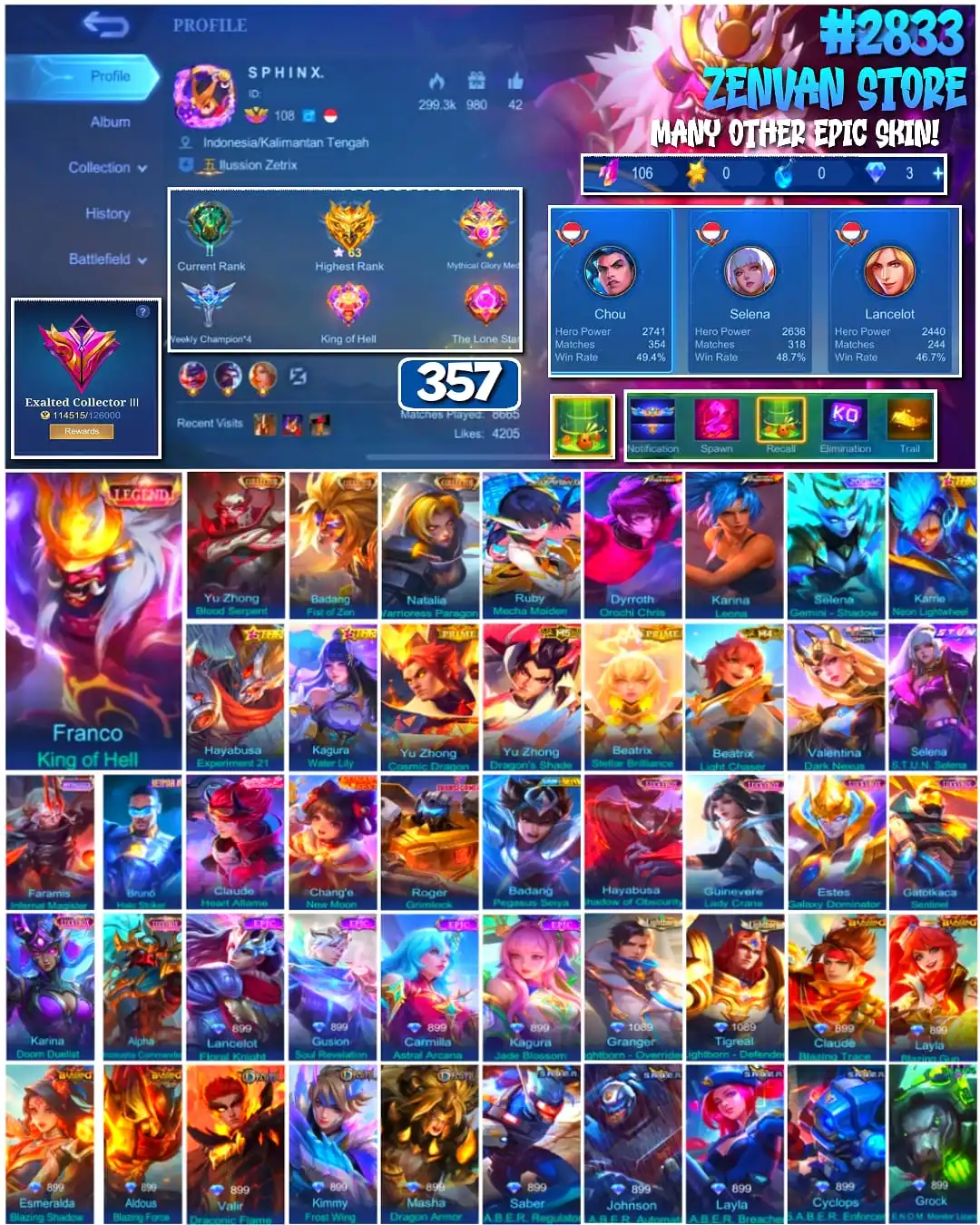 #2833 đ„ 357 Skins đ„ Legend Franco đ„ Collector Yu Zhong, Badang, Natalia đ„ Aspirant Ruby đ„ Prime Beatrix, Yu Zhong đ„ Transformers Roger đ„ KoF Dyroth, Karina đ„ Many Limited đ„ Many Epic đ„ Safe Account â