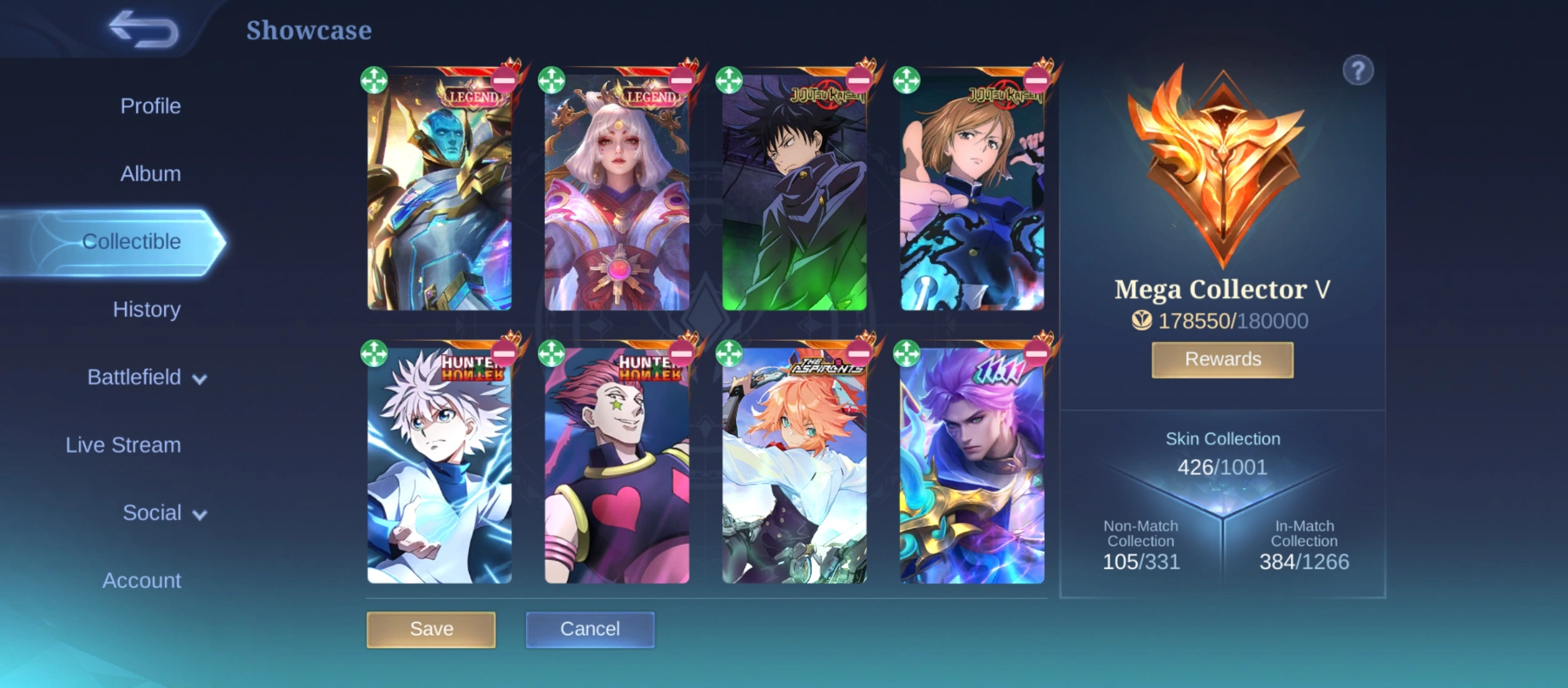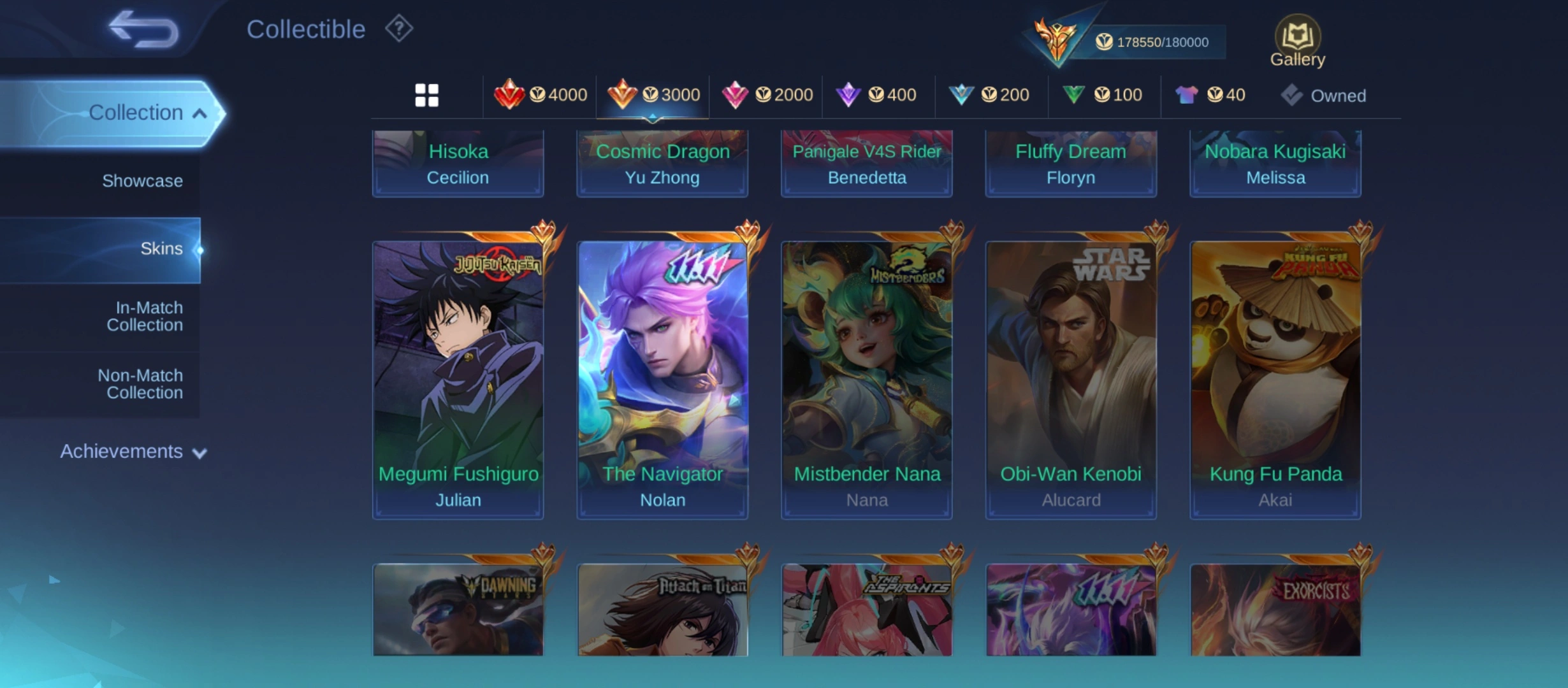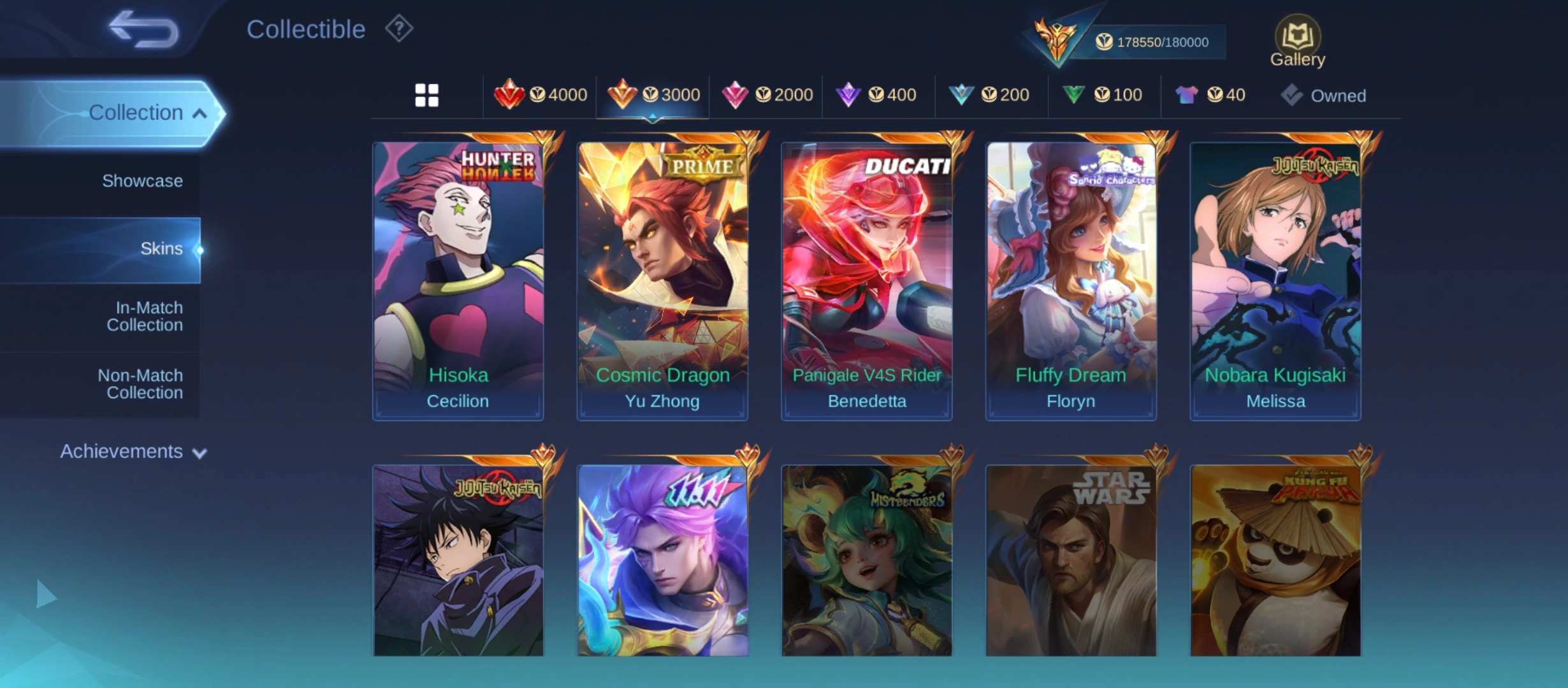 GG806|Lvl 69|MEGA COLLECTOR 5|61% HIGH WR|426 SKIN|2 LEGEND|2 JJK(MEGUMI,NOBARA)|2 HXH|FANNY ASPIRANTS|2 ALLSTAR|DARTH STARWARS|NOLAN 11.11|BENED DUCATI