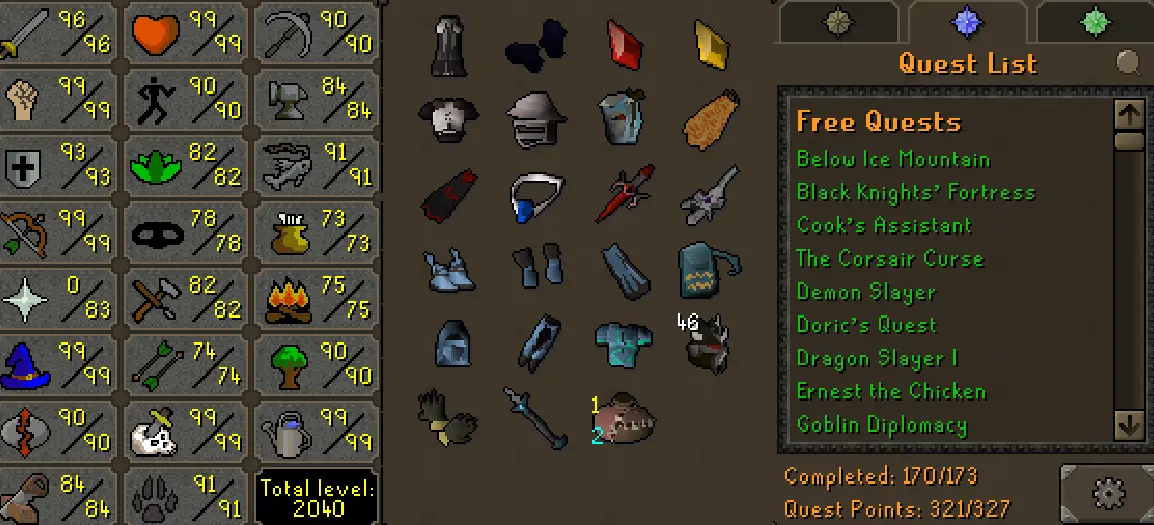 Main | 2040+ Total | 321 QP | 99 Strength | 99 Ranged | 99 Magic | F Cape | E Void | Assembler | B Gloves | D Def | Divine Rune Pouch | Skilling Outfits ⸱ CG186520-5112