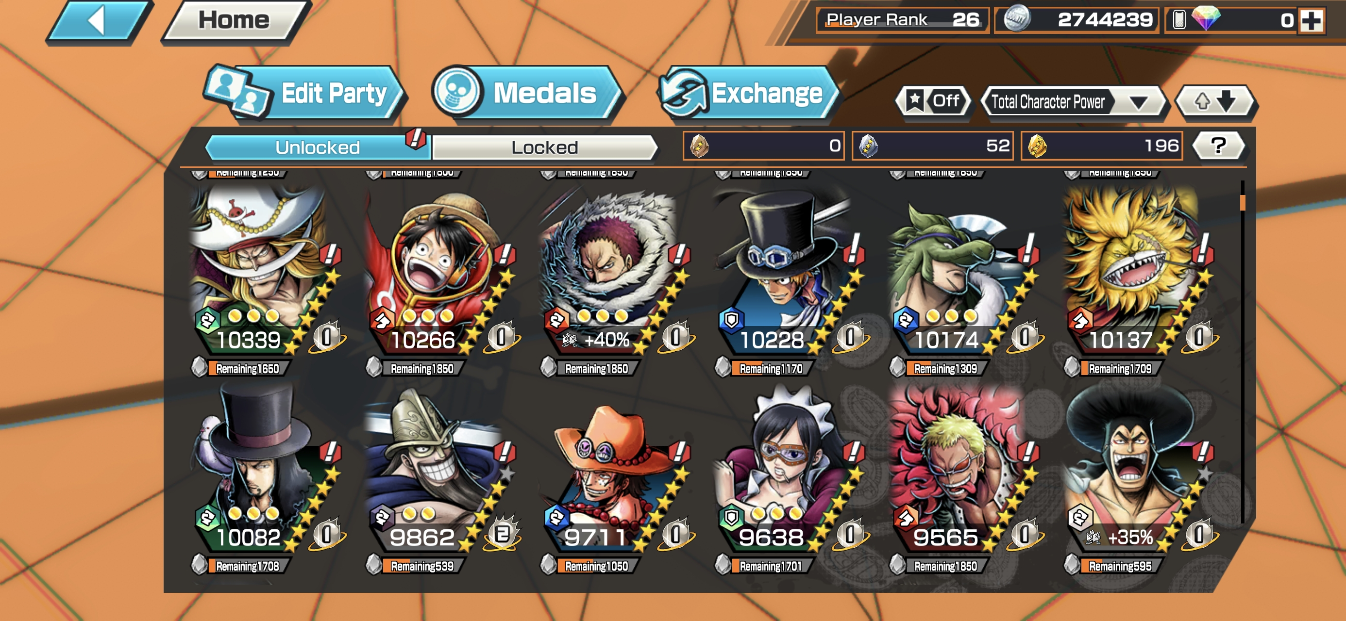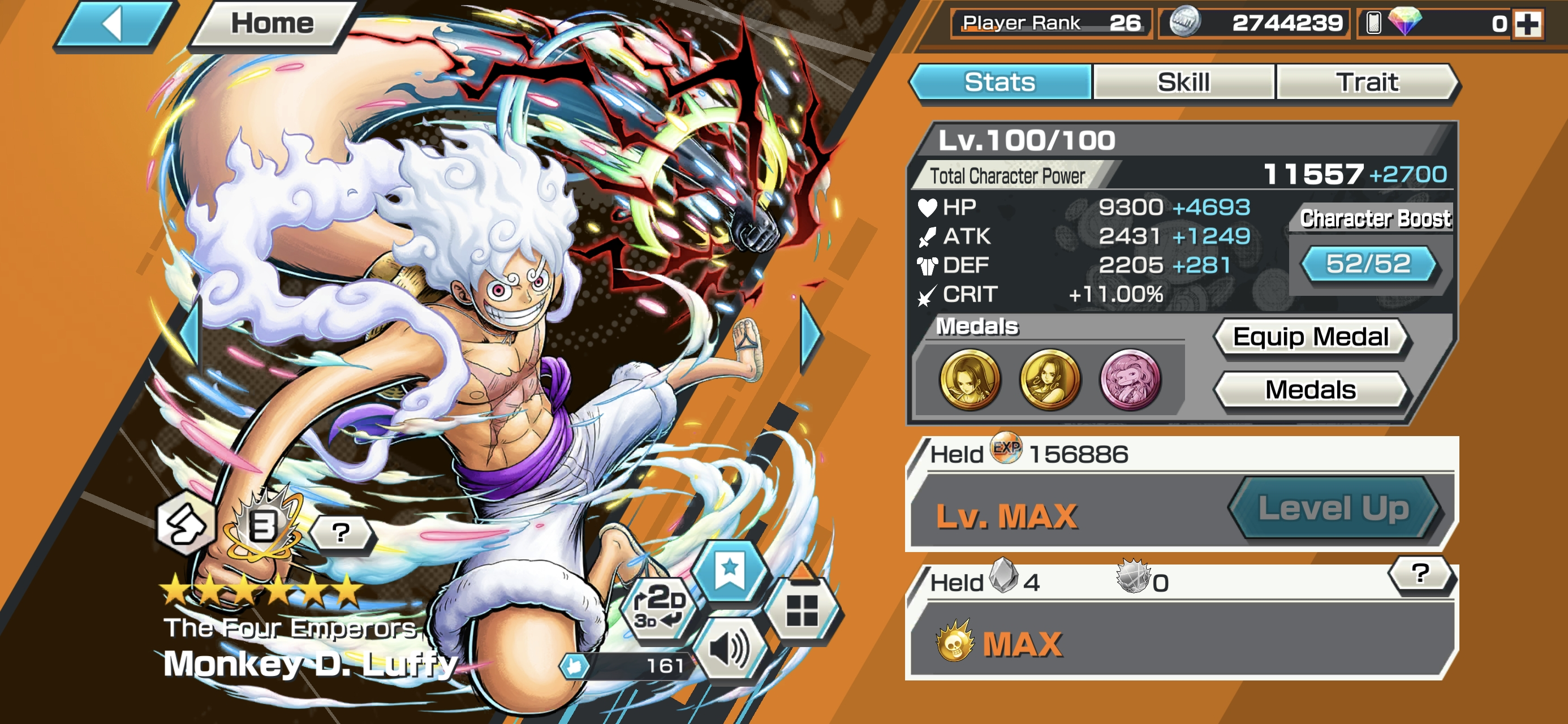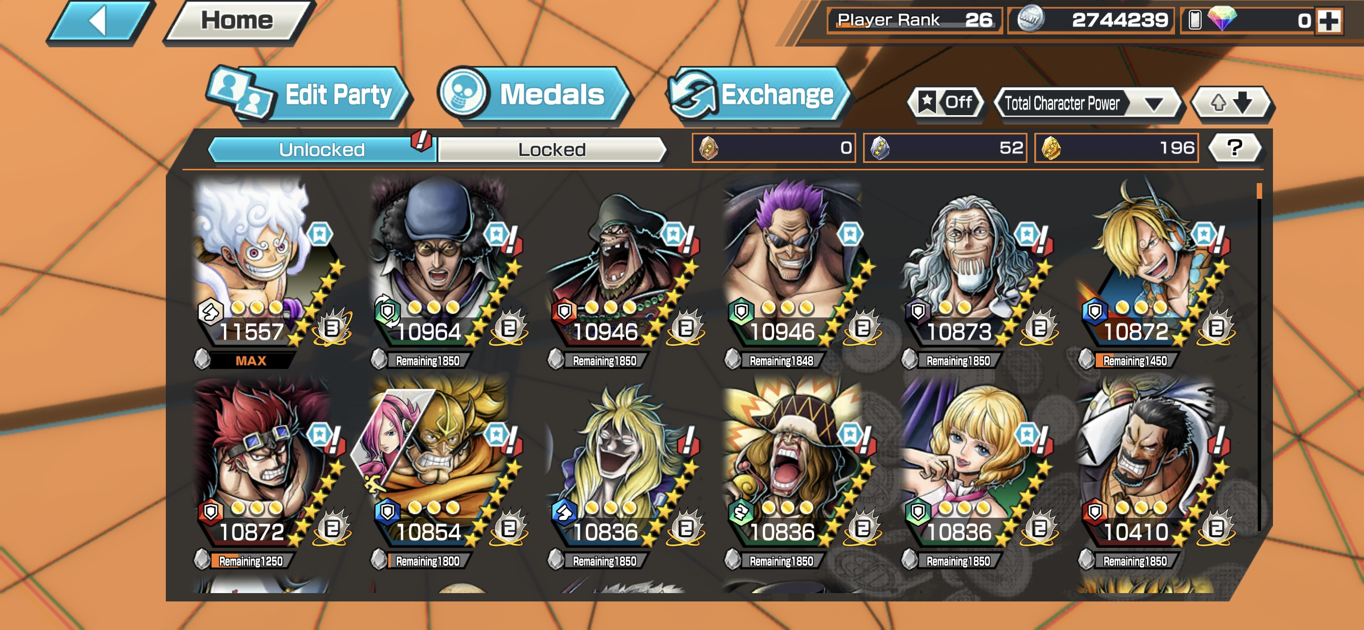 Luffy V2 Max Full Boost 3 ⸱ HB 7 ⸱ 4 Ex Meta Max ⸱ Kuzan Max ⸱ Marshall Max ⸱ Zephyr Max ⸱ Egghead Sanji Max ⸱ Eustas Kid Max ⸱ Vinsmoke Max ⸱ Support 142 ⸱ Good Medal ⸱ Gems ⸱ Many Medal Material ⸱ B473