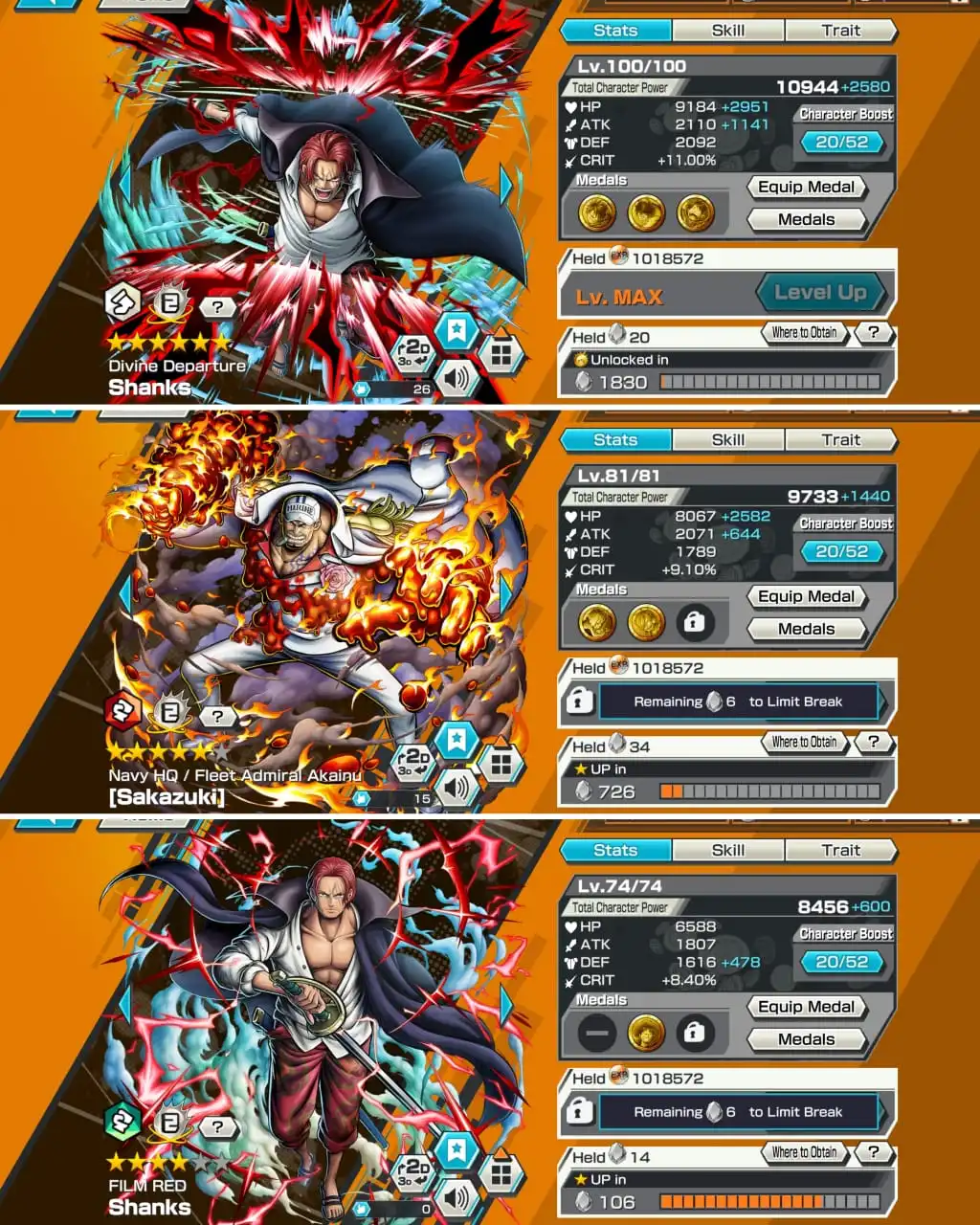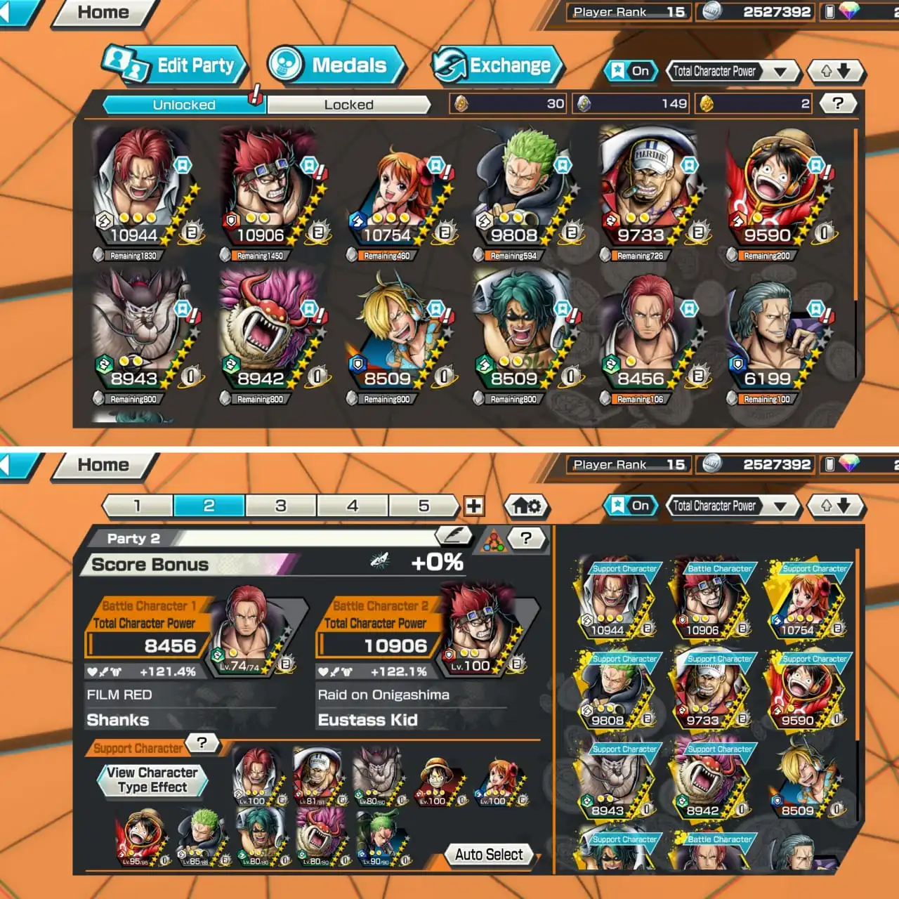 OP175✨3EX 1MAX✨SHANKS MAX✨AKAINU✨FILM RED SHANKS✨SUPPORT 121 %✨EUSTAS KID MAX✨GOOD MEDALS✨MANY CHARACTER✨ANDROID/IOS