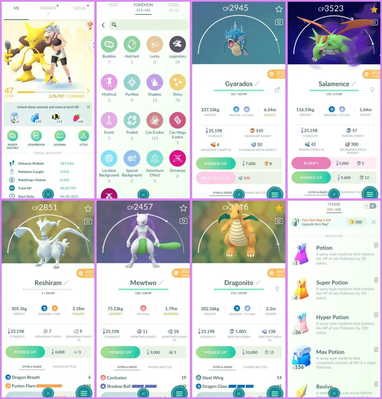 LEVEL 47(INSTINCT)🔥313/425 Pokemon🔥70 Shiny🔥29 Legendary🔥Shiny Mewtwo🔥Legendary Reshiram🔥Name Change Available🔥Instant Delivery