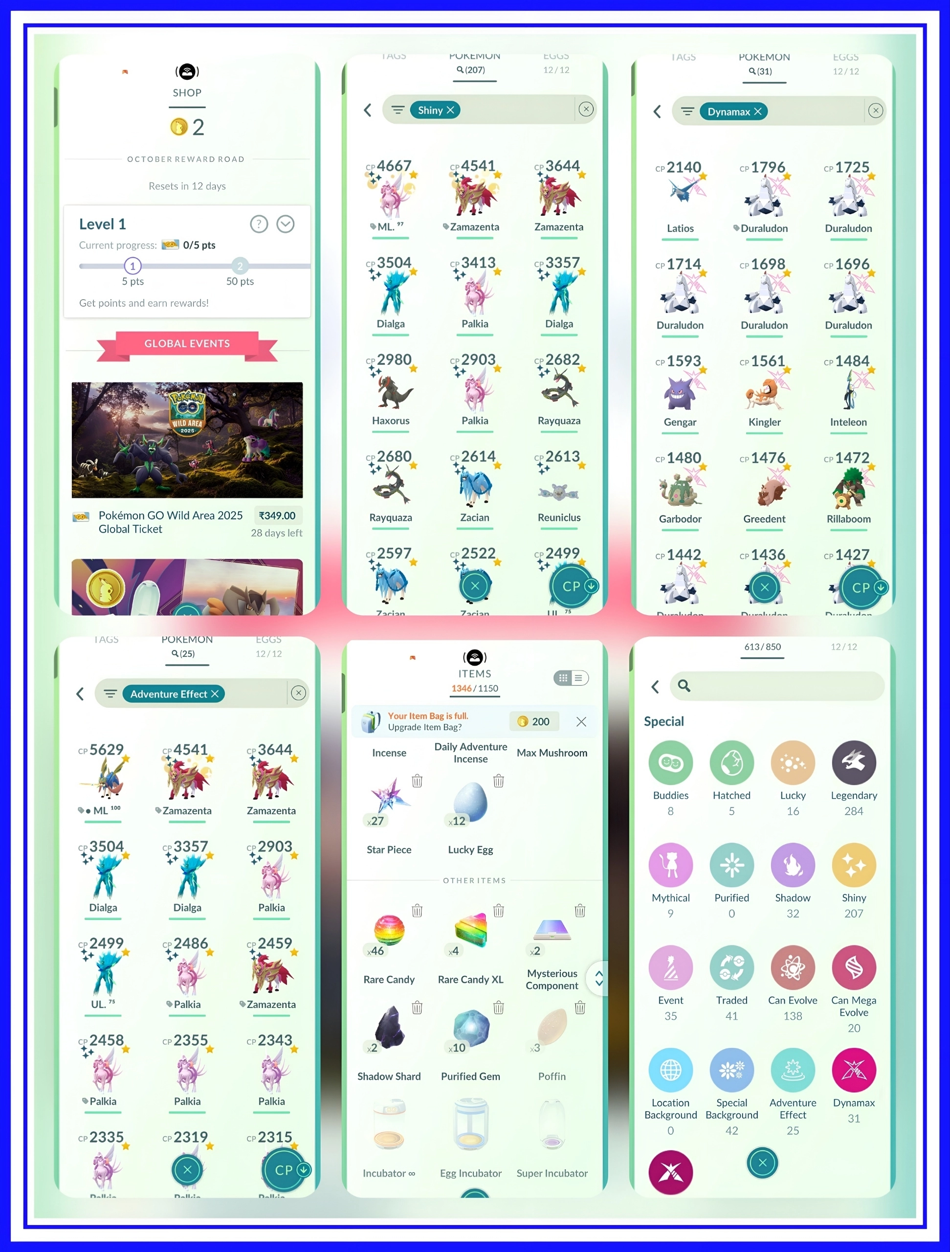 🔥LVL 60(YEAR 2025)🗿SHINY MAXED OUT ZACIAN & ZAMAZENTA😘3 X SHINY SP BG💀43 SHINY LEGENDARY🍁293 LEG,MYTH🤯207 SHINY😎31 DMAX & 14 GMAX 🥵 OP STORAGE♾️35 EVE MONS 🍁OP ACC🔥 #JM