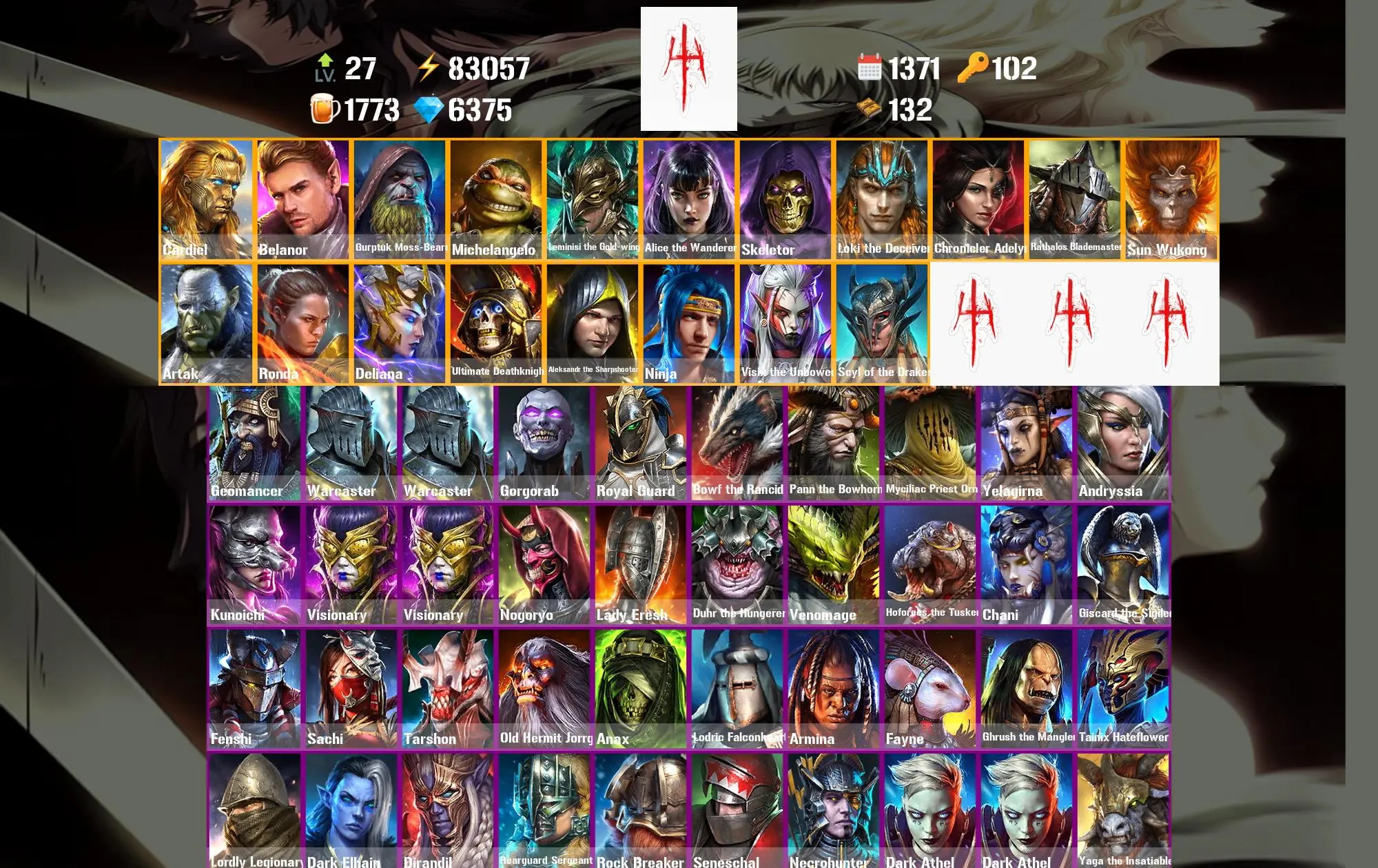 1371 Days 83.1k Energy Cardiel ⸱ Belanor ⸱ Gurptuk Moss-Beard ⸱ Michelangelo ⸱ Leminisi the Gold-wing ⸱ Geomancer ⸱ Warcaster ⸱ 51.0m Silver ⸱ 6.4k Gems