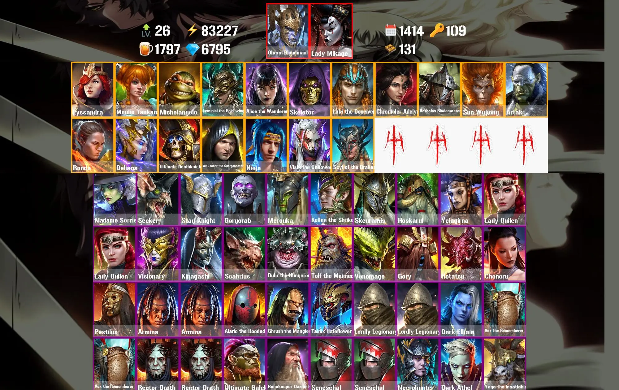 1414 Days 83.2k Energy [Mythical Starter] Gharol Bloodmaul ⸱ Lady Mikage ⸱ Lyssandra ⸱ Maulie Tankard ⸱ Michelangelo ⸱ Leminisi the Gold-wing ⸱ Alice the Wanderer ⸱ Madame Serris ⸱ Seeker ⸱ 51.5m Silver ⸱ 6.8k Gems