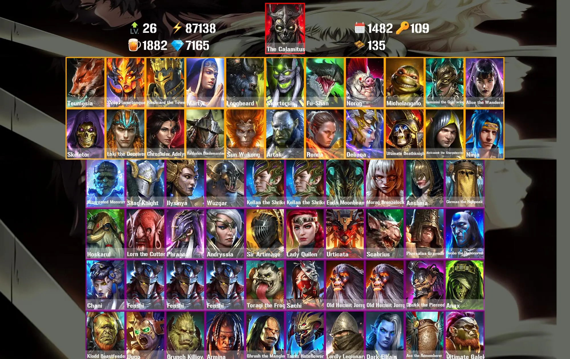 1482 Days 87.1k Energy [Mythical Starter] The Calamitus ⸱ Teumesia ⸱ Sicia Flametongue ⸱ Roshcard the Tower ⸱ Martyr ⸱ Longbeard ⸱ Miscreated Monster ⸱ Stag Knight ⸱ 55.5m Silver ⸱ 7.2k Gems