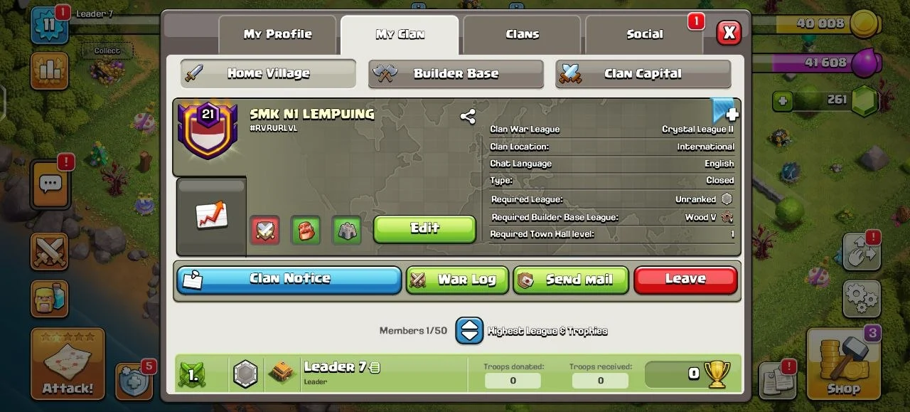 Great Clan 💎 Level 21 💎League Crystals 2 💎War Log Win 333 Lost 271 💎 Capital 9