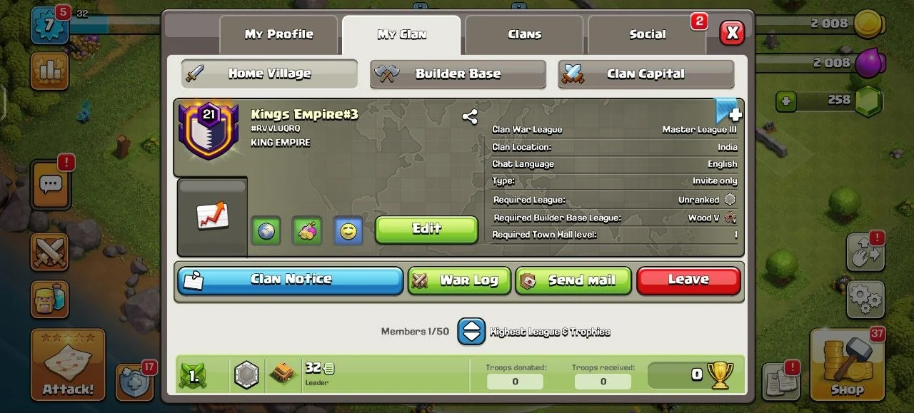 Level 21 💎Name💎Kings Empire3 💎League💎Master 💎 Best War Log Win 334 Lost Only 215 💎OP Clan