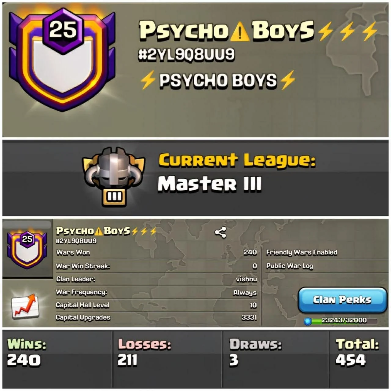 Phycho Boys 🔥 Level 25 🔥Master League 🔥Capital Hall 10 Full Max 🔥War Log Win 240 Lost 211 | Best🔥Clan