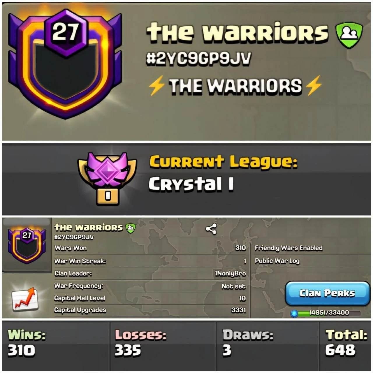 Level 25 💎Win Streak 10💎 Name Single Word 💎War Win 583 Lost 133 💎 4/1 War Log 💎 League Crystals 💎 Capital 9