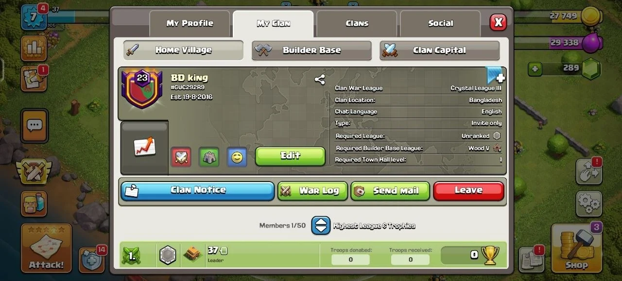 Great Clan 💎 Level 21 💎League Crystals 2 💎War Log Win 333 Lost 271 💎 Capital 9