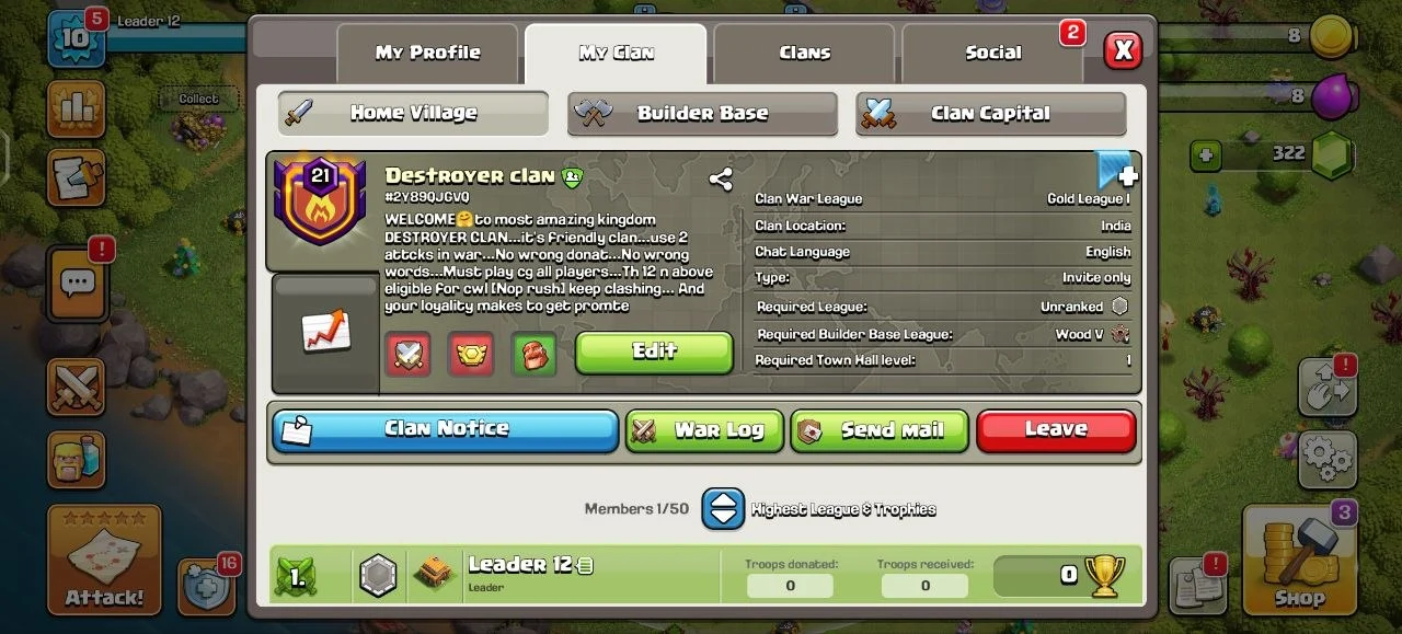 Name💎Destroyer Clan 💎 Level 21 💎 Capital 10 Almost Max 💎Posative War Log💎 Win 202 Lost 190 58