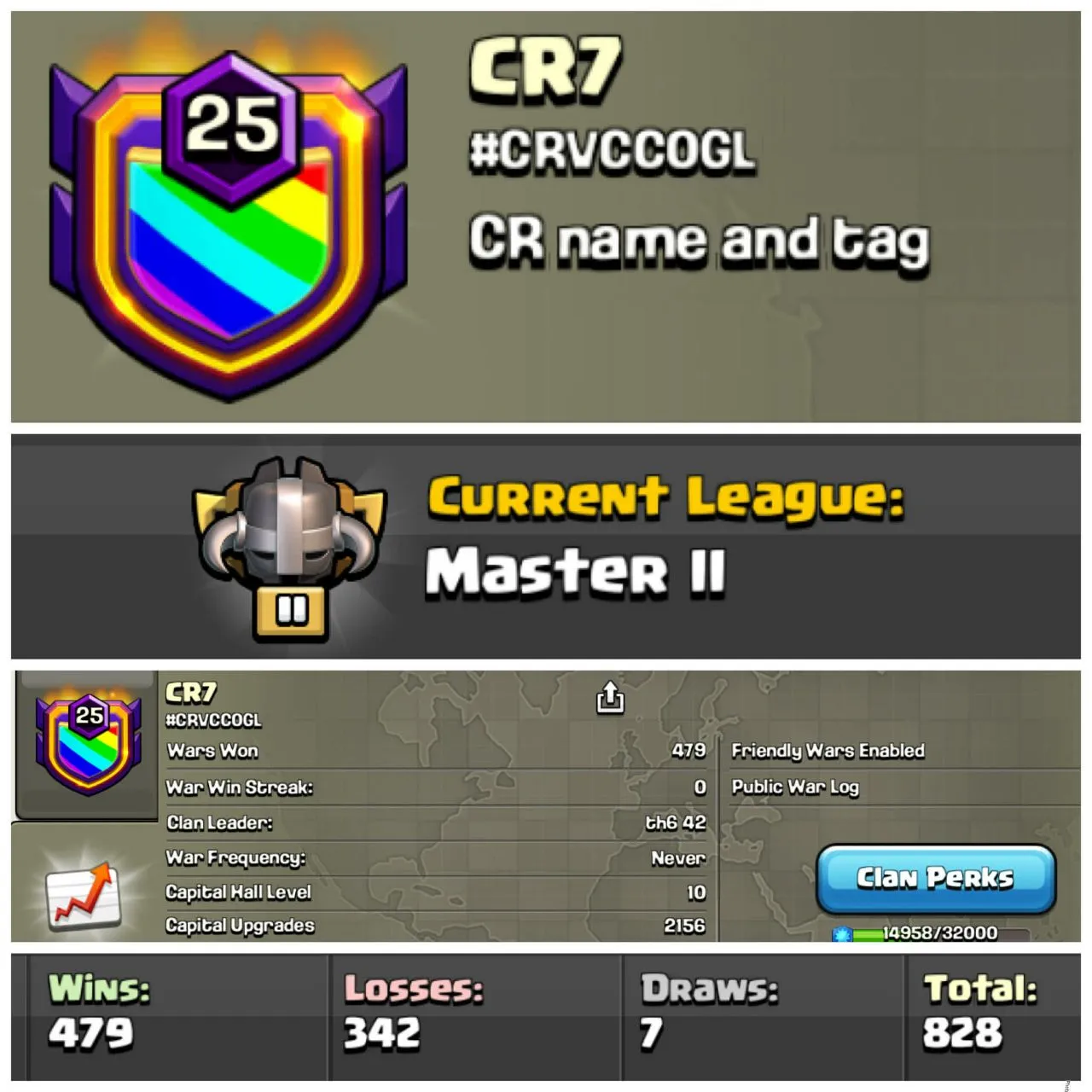 Name: CR7 [] Level-25 [] Cristiano Ronaldo Fans Clan [] League Master 2 [] Capital 10 [] War Log Win 479 Lost 342 Best