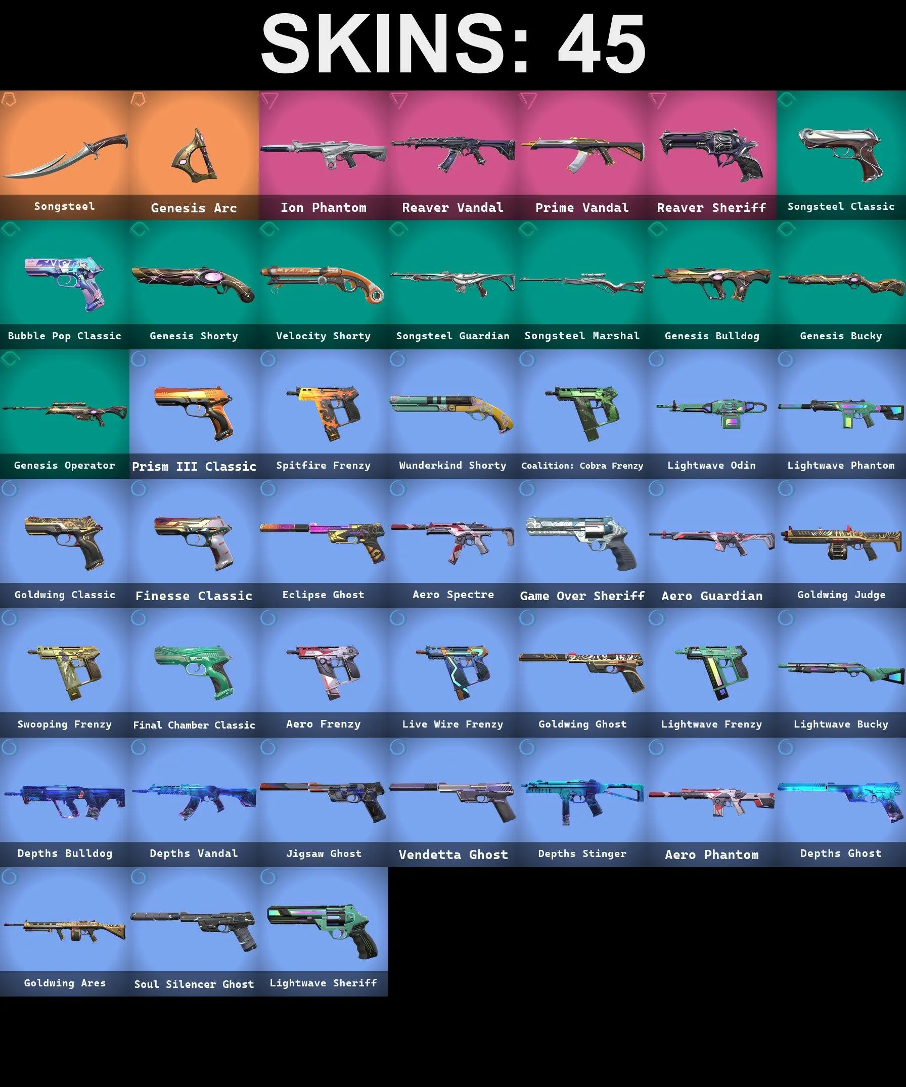 45 SKINS | 2 KNIFE | REAVER VANDAL | REAVER SHERIFF | PRIME VANDAL | ION PHANTOM | SONGSTEEL | GENESIS ARC | SONGSTEEL CLASSIC | BUBBLE POP CLASSIC | GENESIS SHORTY | VELOCITY SHORTY | SONGSTEEL GUARDIAN | SONGSTEEL MARSHAL | GENE