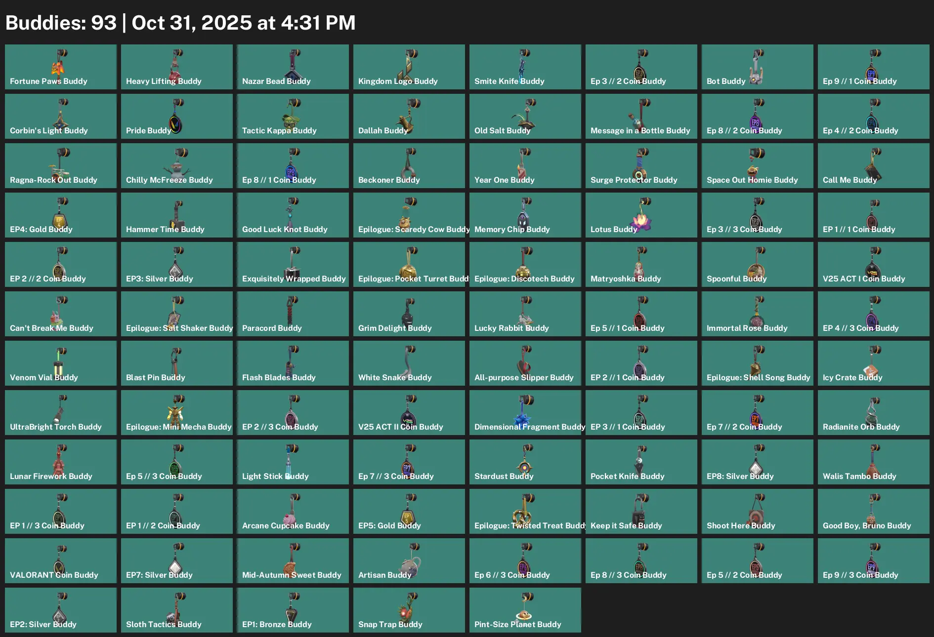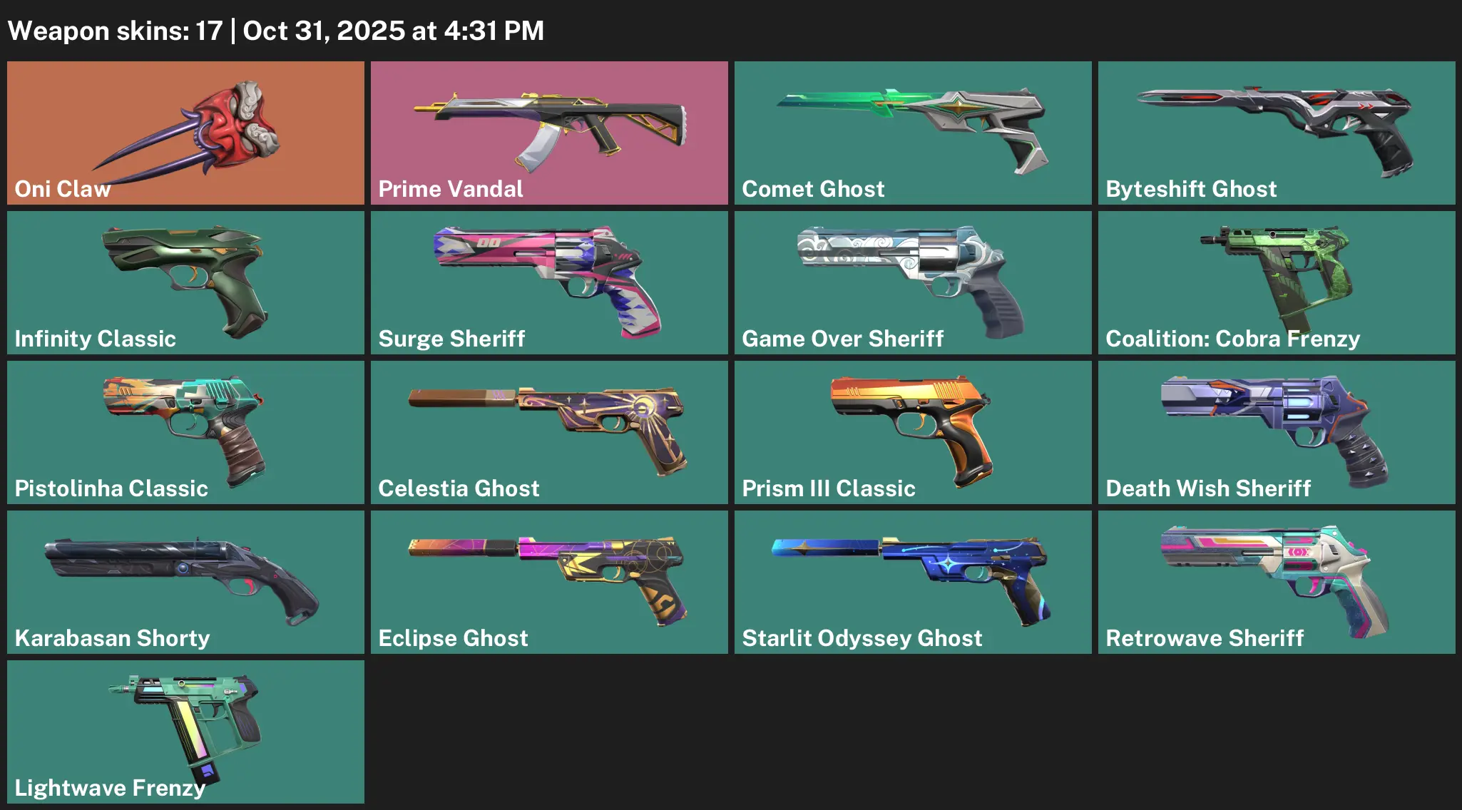 🥐 AP 🌷 Unranked 🍻 17 Skins 🫀 170 VP 🖊 22 Agents 🪫 Value: 5325 VP 🪢 Oni Claw 🚎 Prime Vandal 🥫 Comet Ghost 🪑 Byteshift Ghost ⛓ Infinity Classic 🚝 Surge Sheriff