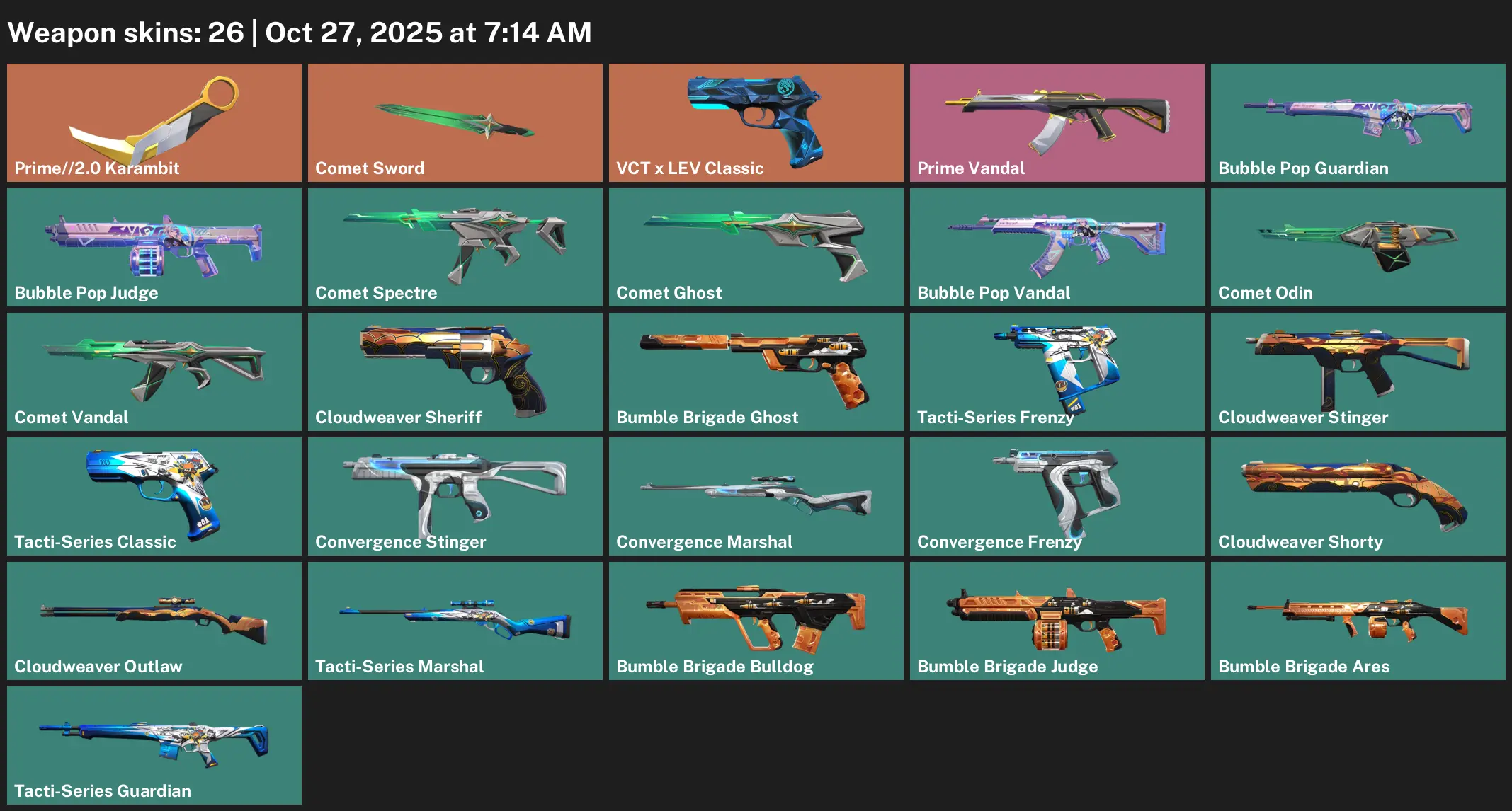 ⛏ AP 🛸 Unranked 🚰 26 Skins 💸 335 VP 🩸 16 Agents 🐰 Value: 5325 VP 🚜 Prime//2.0 Karambit 🌈 Comet Sword 🍰 VCT x LEV Classic 🍸 Prime Vandal 🩰 Bubble Pop Guardian 🚏 Bubble Pop Judge