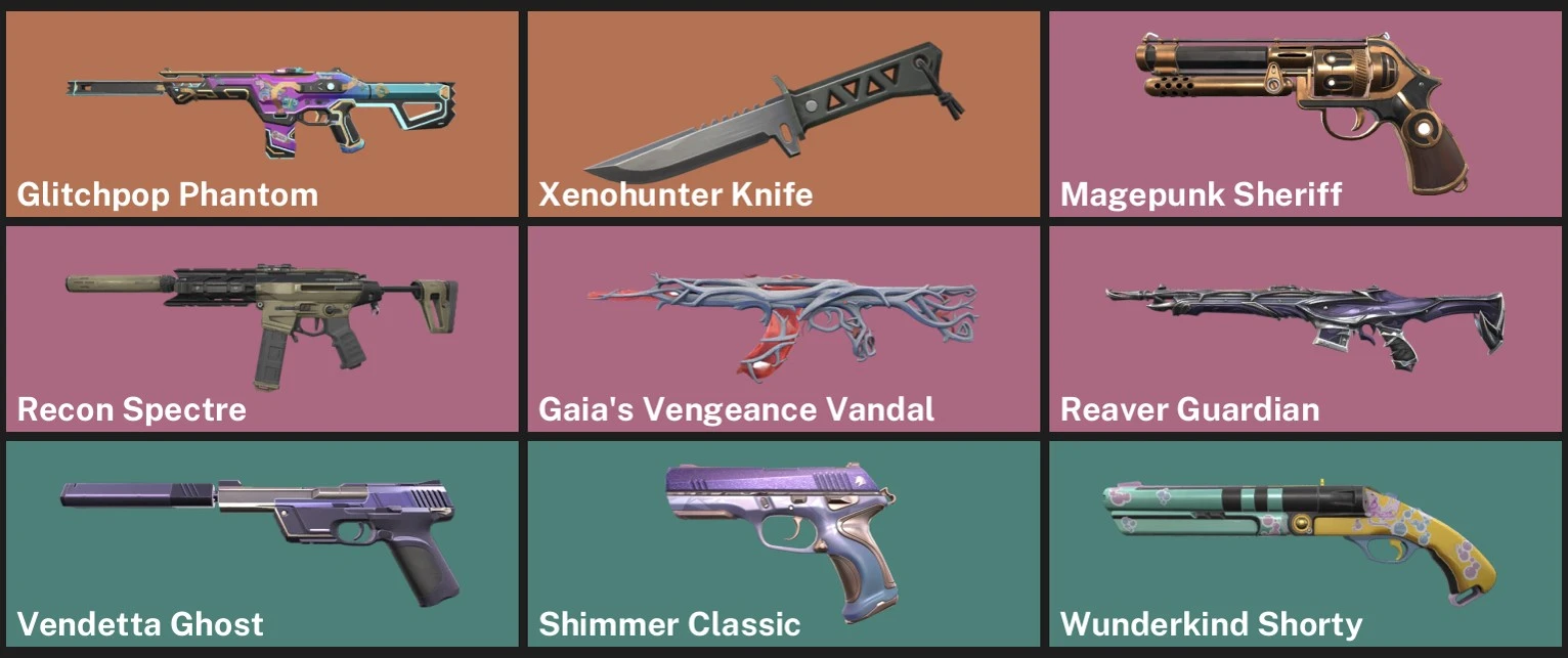 EU ⸱ LVL 77 ⸱ UNRANKED ⸱ 1 KNIFE ⸱ 9 SKINS (~12,825 VP) Glitchpop Phantom, Xenohunter Knife, Magepunk Sheriff, Recon Spectre, Gaia's Vengeance Vandal