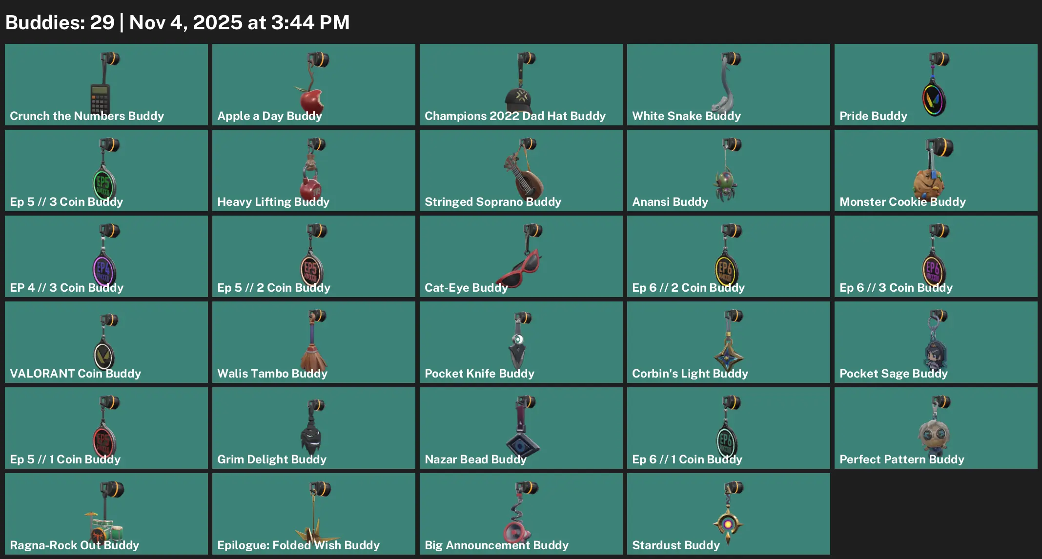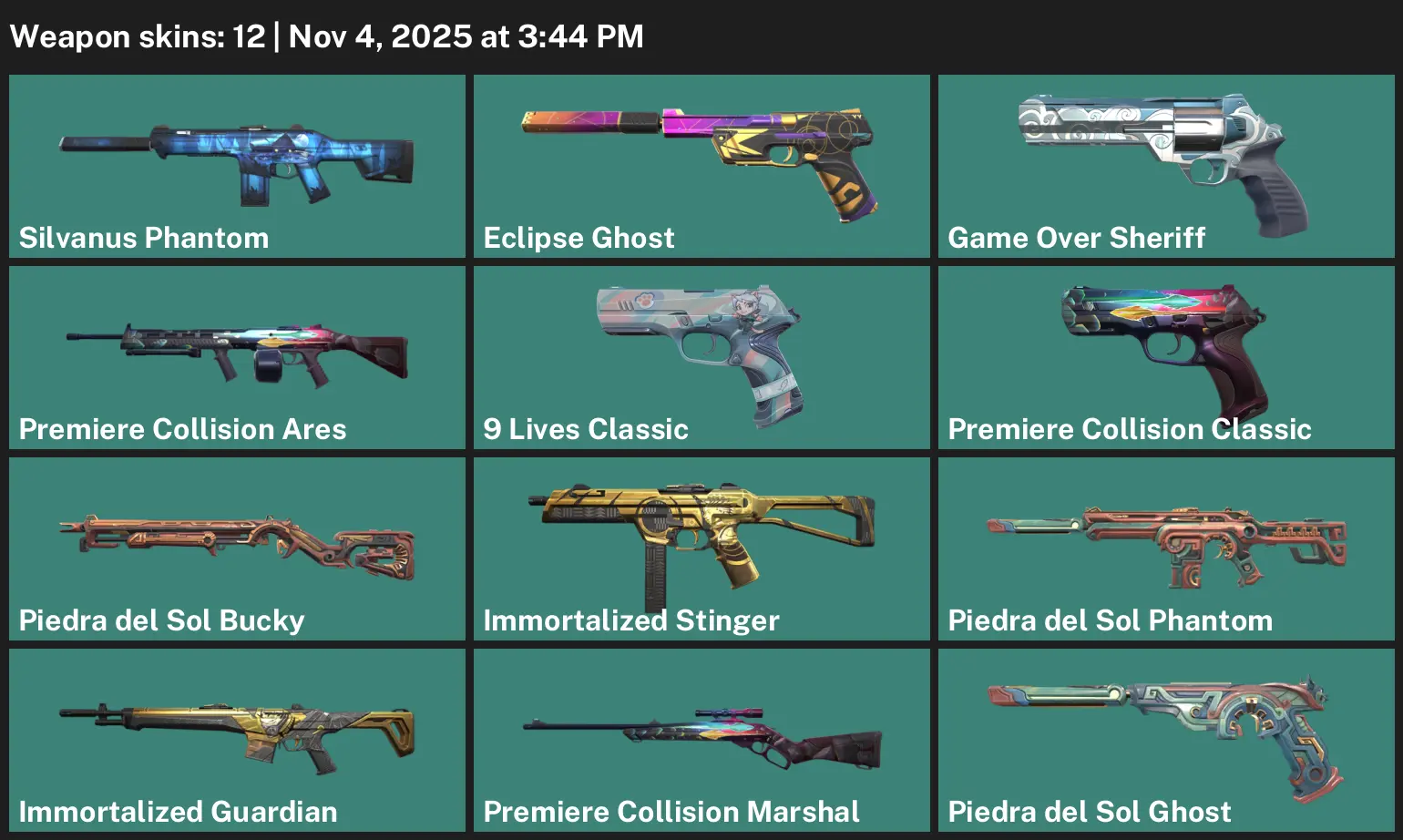 🤯 EU 🦐 Unranked 🙄 12 Skins 🪜 149 VP 🖍 16 Agents 🥞 Value: 1275 VP 🥙 Silvanus Phantom 🎨 Eclipse Ghost 🦪 Game Over Sheriff 🪟 Premiere Collision Ares 🦉 9 Lives Classic 💳 Premiere Collision Classic