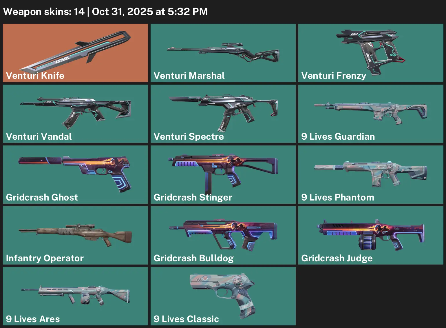 🐉 EU 🍓 Unranked 🐗 14 Skins 🪿 65 VP 🛼 5 Agents 🫱 Value: 875 VP 👁 Venturi Knife ⛵️ Venturi Marshal 🥹 Venturi Frenzy 🏛 Venturi Vandal 🐥 Venturi Spectre 🫣 9 Lives Guardian