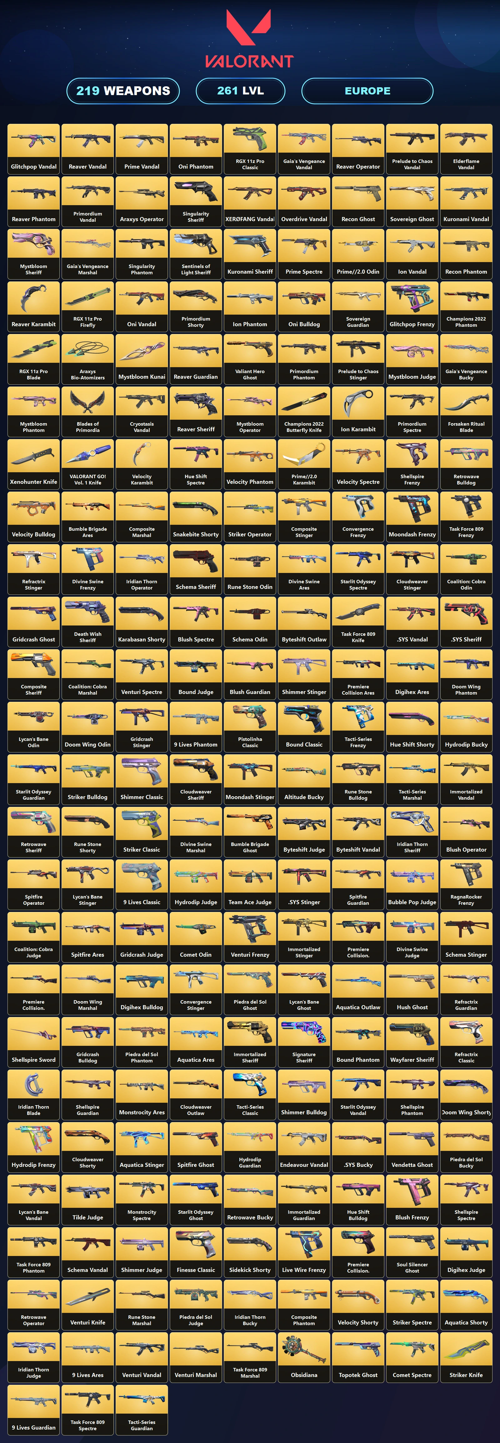 EU 🪐 219 Skins 🤞 261 Level ⛱ Champions 2022 Phantom 👢 Champions 2022 Butterfly Knife 🎯 Kuronami Vandal 🚍 Elderflame Vandal 🍋 Reaver Vandal 🧊 Reaver Phantom 💠 Prime Vandal 🪙 Unranked 🔥 21 Agents
