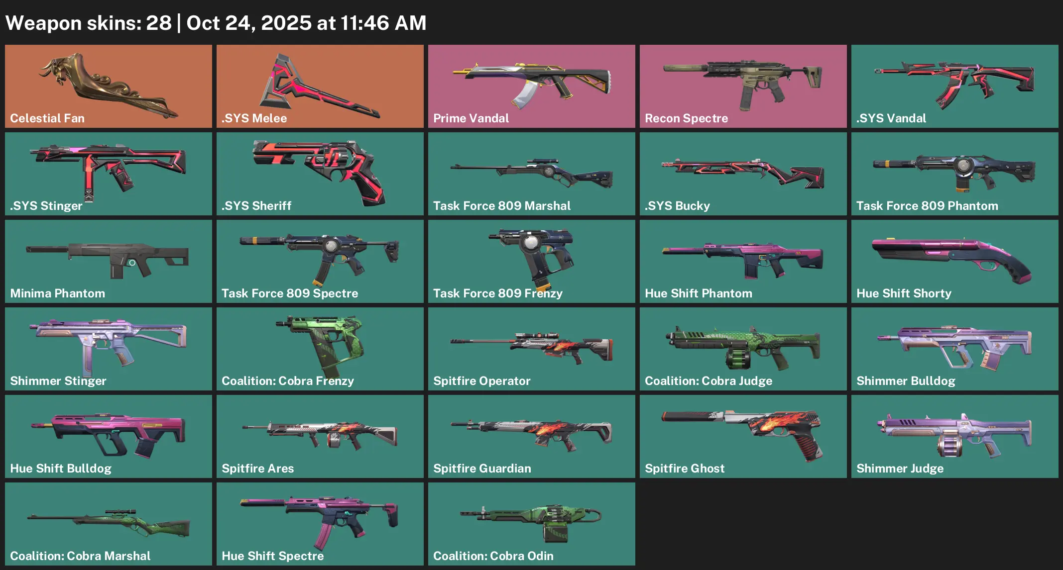 🚌 EU 🥦 Unranked 🎍 28 Skins 😷 157 VP 💺 5 Agents ⛄️ Value: 8375 VP 😛 Celestial Fan 😫 .SYS Melee 🪳 Prime Vandal 🥤 Recon Spectre 🤌 .SYS Vandal 🖲 .SYS Stinger
