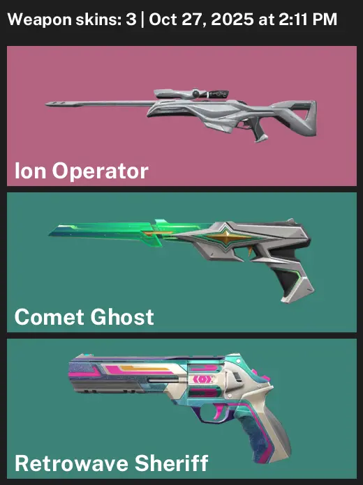 📋 EU 🎗 Unranked 🥄 3 Skins 💸 140 VP 🎿 15 Agents 🤲 Value: 1775 VP 🛎 Ion Operator 🐈⬛ Comet Ghost 🧗 Retrowave Sheriff
