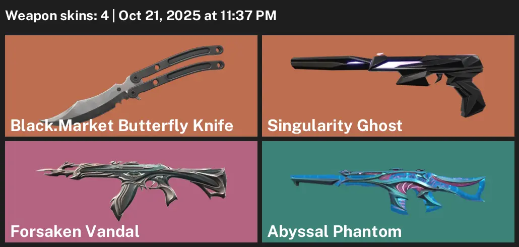 🗾 EU 🐄 Unranked 👂 4 Skins 😂 4071 VP ✏️ 3 Agents 🏣 Value: 8775 VP 📆 Black.Market Butterfly Knife 🐆 Singularity Ghost 🙈 Forsaken Vandal 🐜 Abyssal Phantom