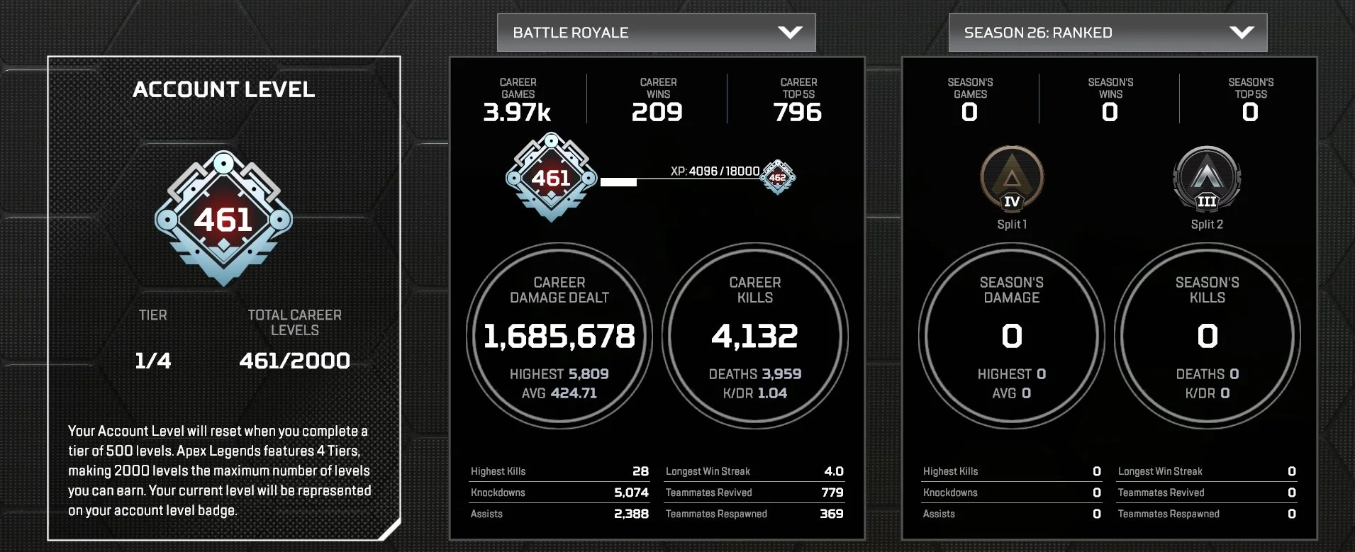 PC | x4 Heirlooms + x2 Exotics | 307 Leg Items | BP S1,2,8,9,11,12,14,15,16,17,19 | Silver | Level 461 | Relic: Yes