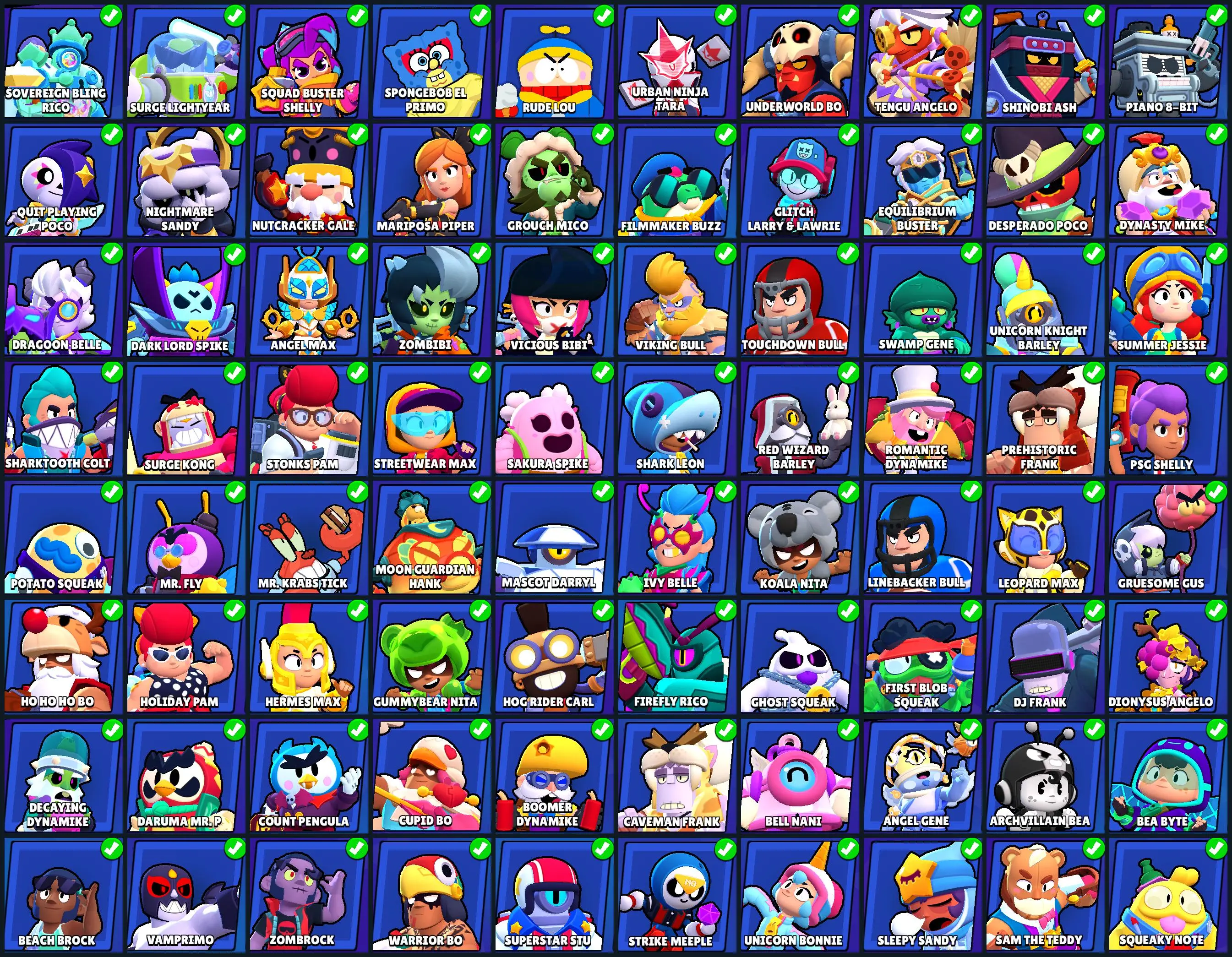 123 SKINS | 28207 TROPHIES | HERMES MAX | FILMMAKER BUZZ | DARK LORD SPIKE | SURGE LIGHTYEAR | HO HO HO BO | CUPID BO | SPONGEBOB EL PRIMO | WARRIOR BO | UNDERWORLD BO | DRAGOON BELLE | PIANO 8-BIT | MARIPOSA PIPER | IVY BELLE | 72 BRAWLERS