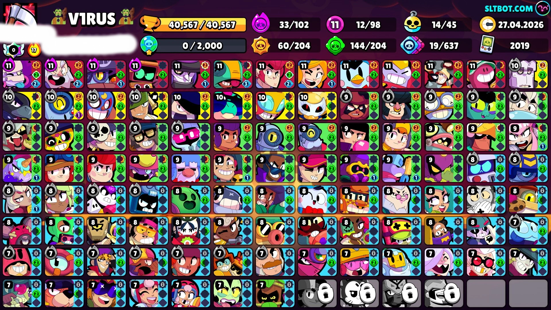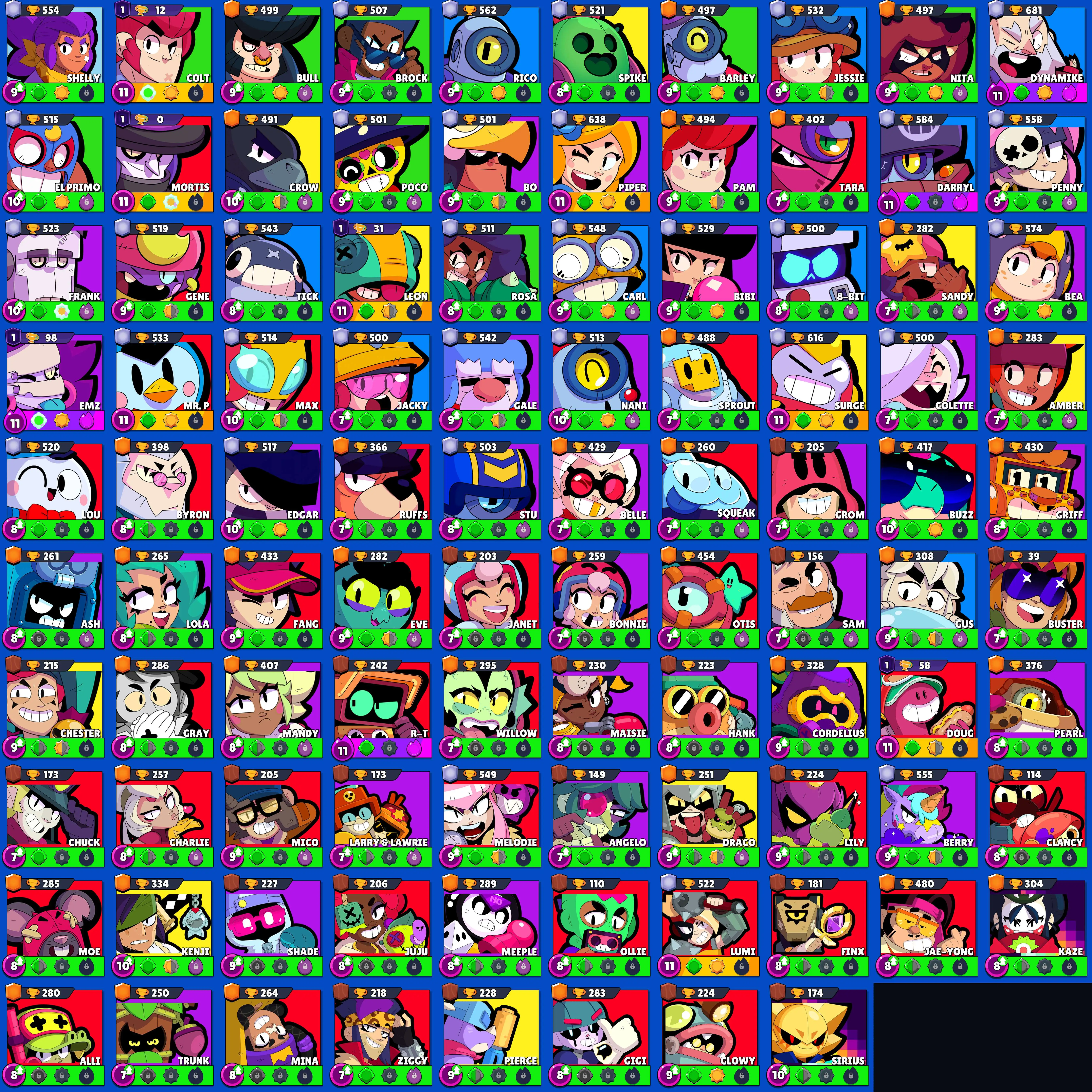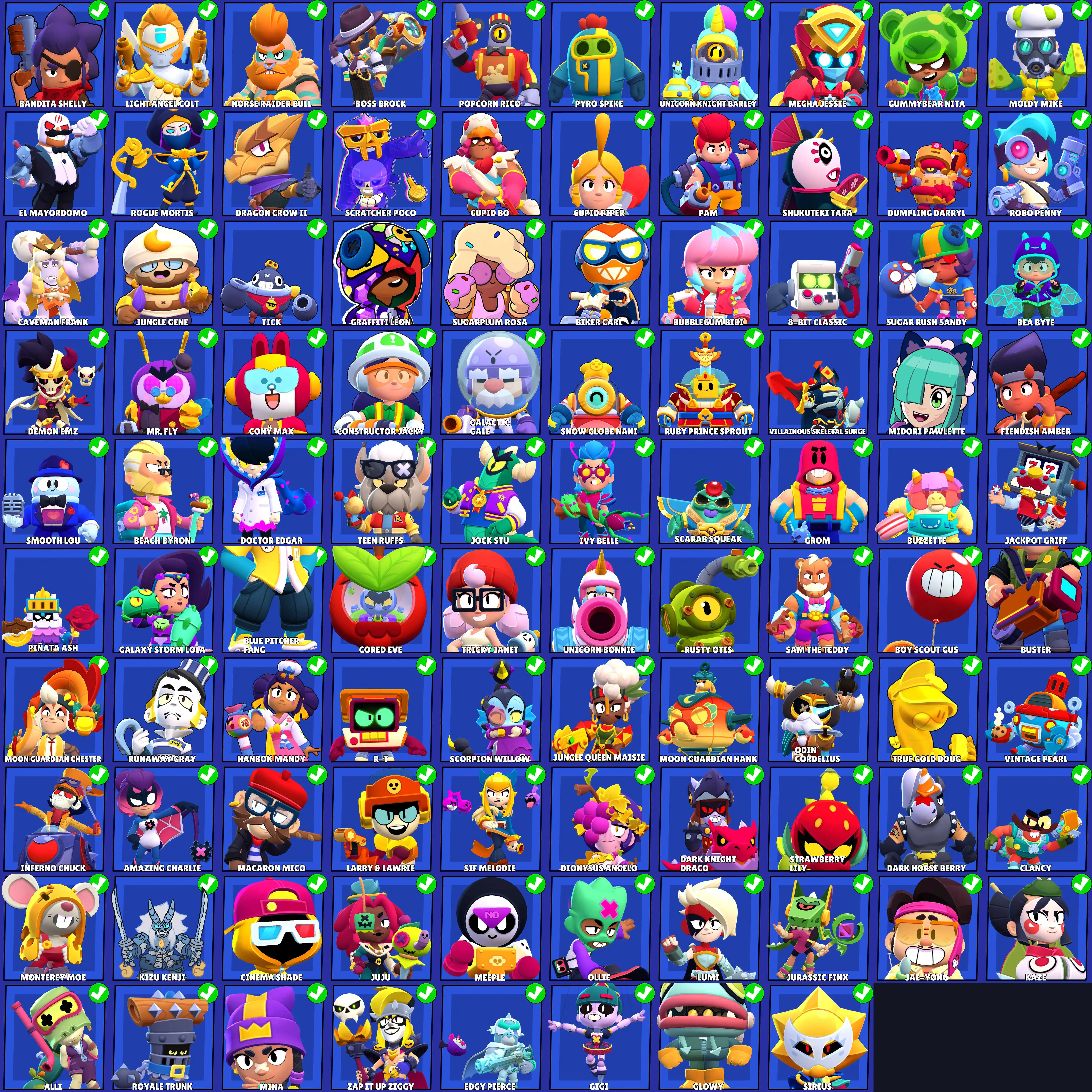 190 SKINS 💯 40.567 TROPHIES 🏆 98 BRAWLERS 🐼 8 HYPERCHARGED 🩸 5 PRESTIGE 💜 12 MAX BRAWLERS 💛 14 BUFFIES 🔑 GODZILLA BUZZ 🧡 KIZU KENJI 🧡 BIKER CARL 🧡 CHERLEADER ROSA 🧡 CUPID PIPER 💯 30K 40K