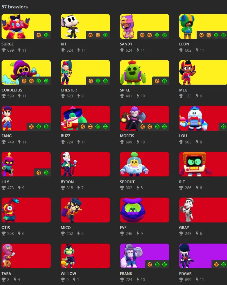 Brawl Stars : 57 Brawlers : 8 Legends : SURGE ; KIT ; SANDY ; LEON ; CORDELIUS ; CHESTER ; SPIKE ; MEG