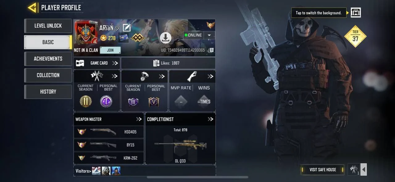 iOS Android 🎮 Level 278 🛍️ Rank Grand Master 🔥 238 Epic 🎯 7 Legendery 🌟 1 Mytich 🧨 121 Epic Soldier 🏆 Code595