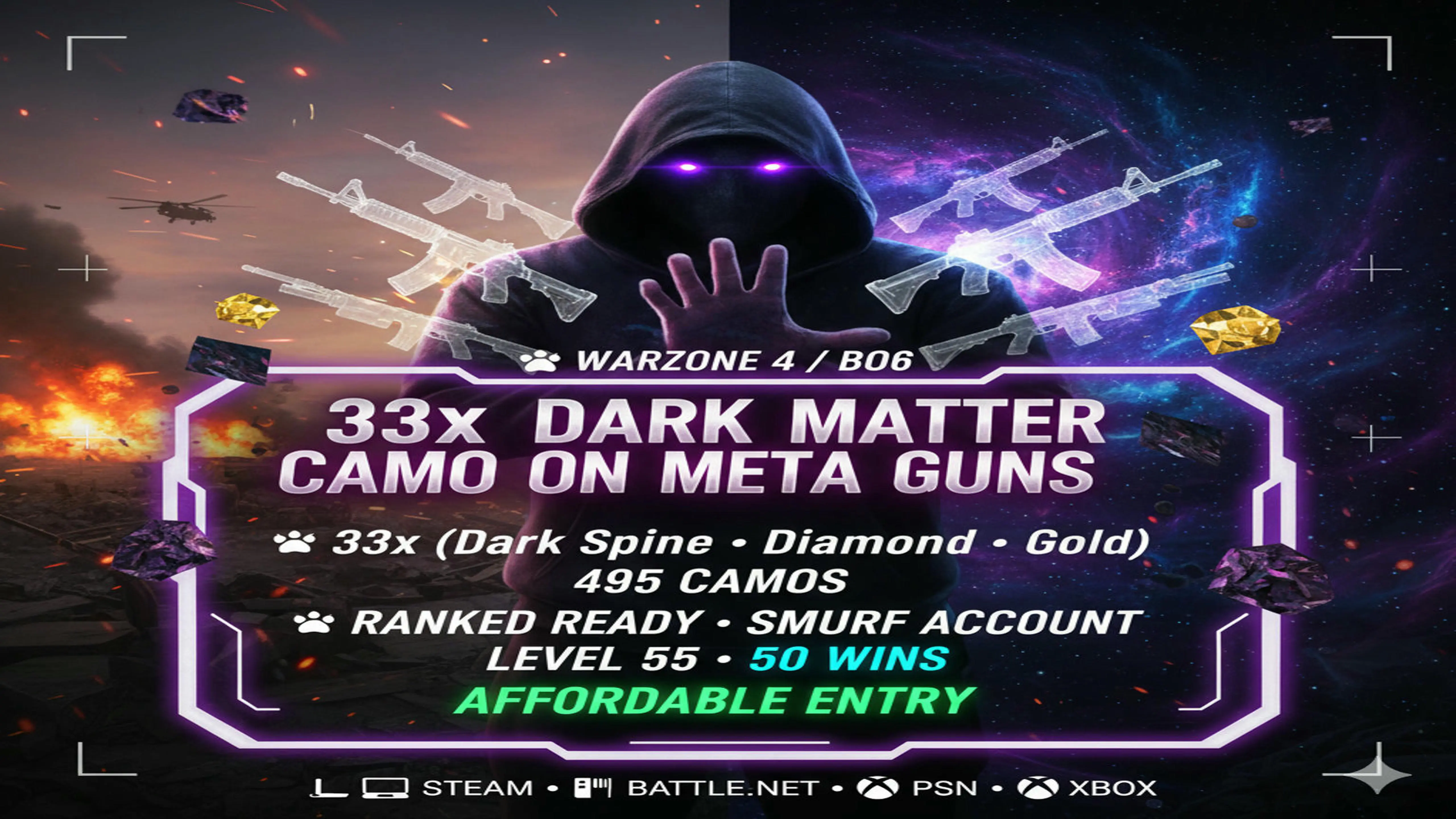 🐾 Any-Region 🐾 Warzone 4 / BO6 🐾 33x Dark Matter Camo on META GUNS 🐾 33x ( Dark Spine , Diamond , Gold ) 🐾 495 Camos 🐾 Ranked Ready 🐾 Level 55 🐾 50 Wins 🐾 Smurf Account 🐾 Affordable Entry 🐾 Account Steam , Battle Net , PSN , XBOX #Ywx1EB