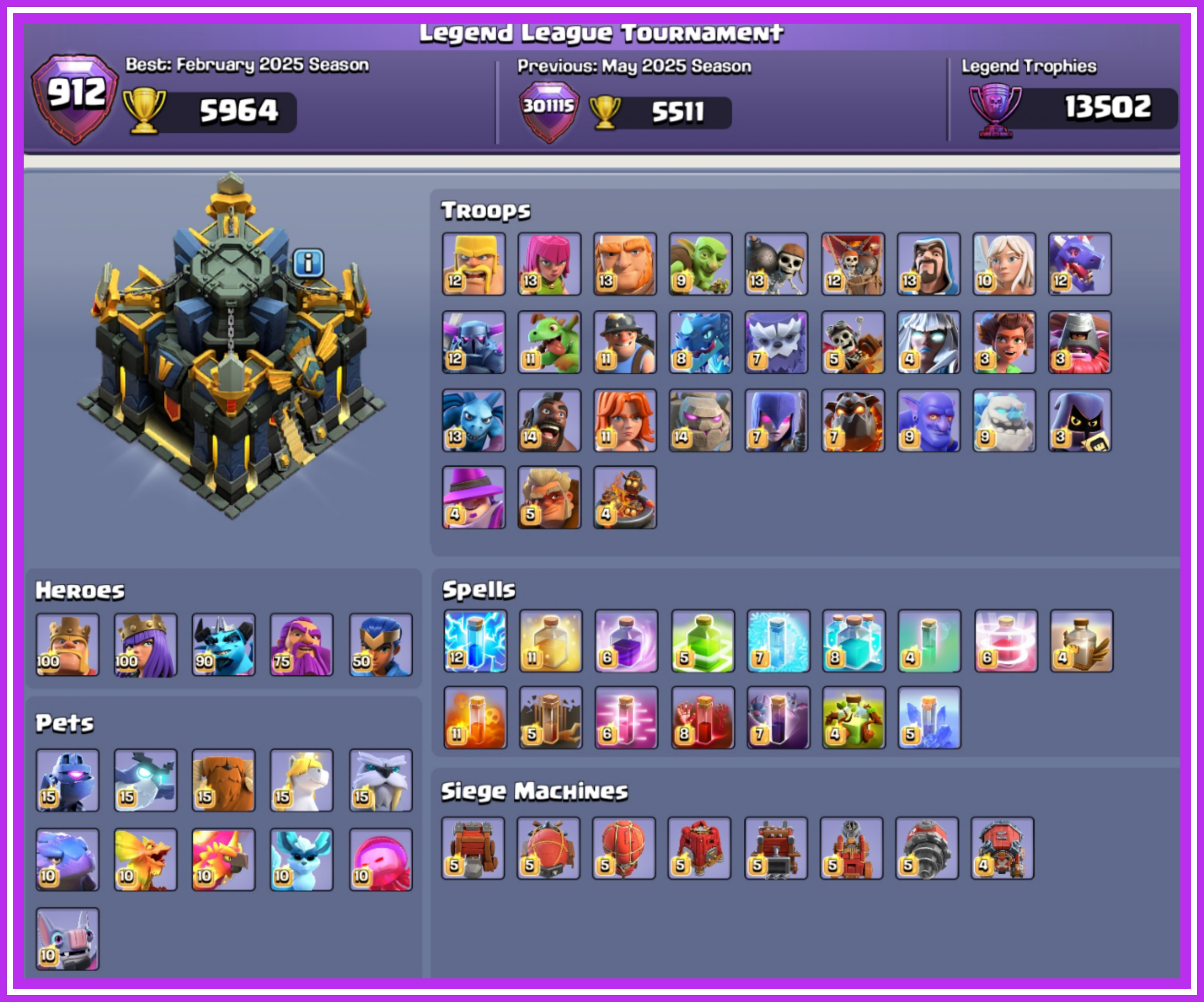 BOTH LEGENDARY SCENERY 🔥 912 RANK 🤯 TH-17 FULL MAX ACCOUNT🎁 HEROS ⸱ 100-100-90-75-50 😍 FULL MAX BASE AND LAB ☠️ XP ⸱ 258 🎁😍 13502 LEGEND CUPS 😍🏆 6039 WAR STARS 🤩🌟 STACKED WITH SKINS AND SCENARIES 💀🤩 INSTANT DELIVERY 🤝 WORKS ON BOTH ANDROID AND IOS ✅💯
