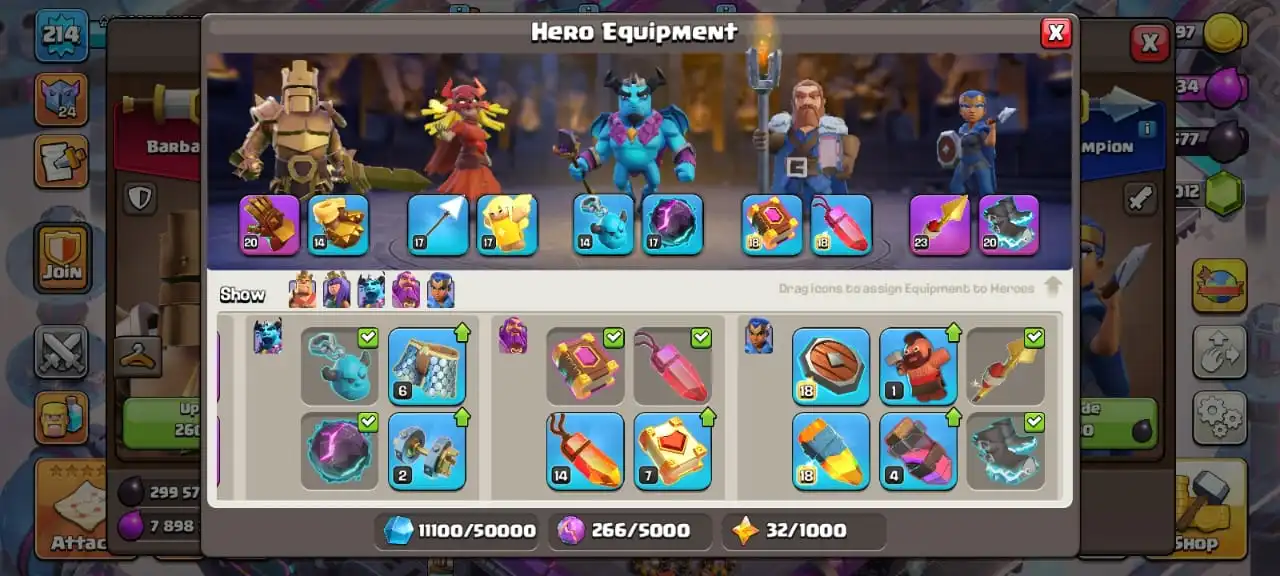 Cheap✅2 legue heroes skin✅TH 16 semi max🔥max walls🔥high heroes level 88/90/66/58/32☠️5 epic equipment⚒️6 builder’s✅cn on