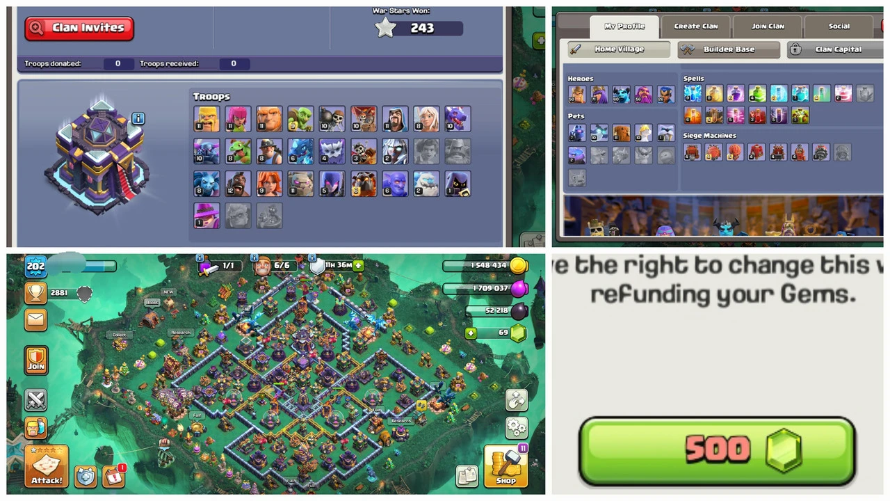 TH 15 Good Defence 🧲 Level 202 👑 Heros 50_71_60_56_26 🗡️ 9 Skin 🚀 4 Epic equipment 💥 1 Scenery 🦅 Nc 500 Gem (Android &iOS) 🏠 M2434