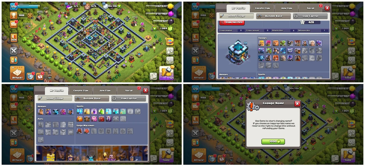 TH13 Good Defence 🪵 Level 120 📊 Heroes 51_68_21_35_19 🍎 Gems 1064 📱 1 Skins 💯 2 Epic equipment 🥉 Nc 1000 (Android & iOS) 🎮 M3660
