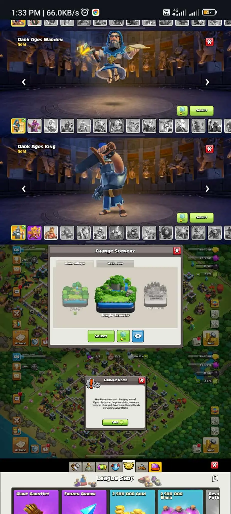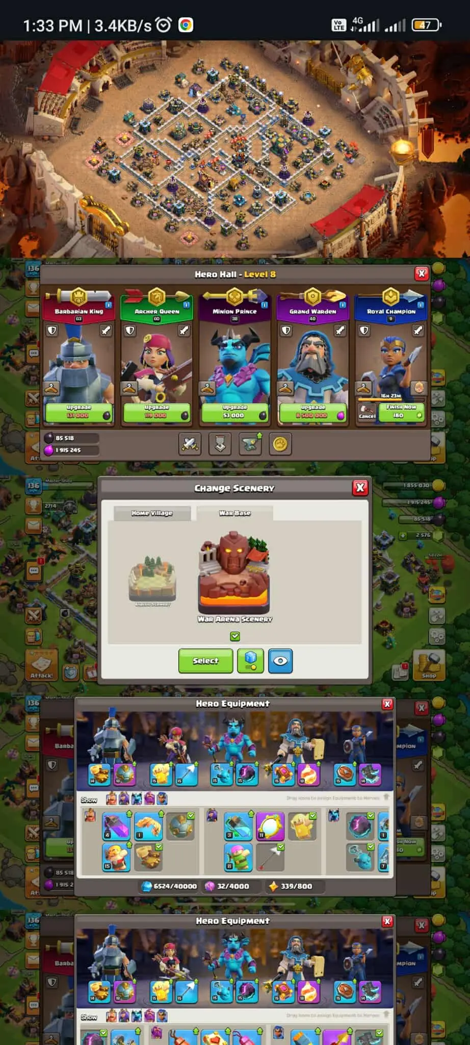 WAR ARENA SCENERY | TH14 MAX ID | 6x EPIC EQUIPMENT | WHITE WALL | 2500+ GEMS | XP-136 | HERO: 63-60-38-40-9| JUNGLE SCENERY | 4 SKIN