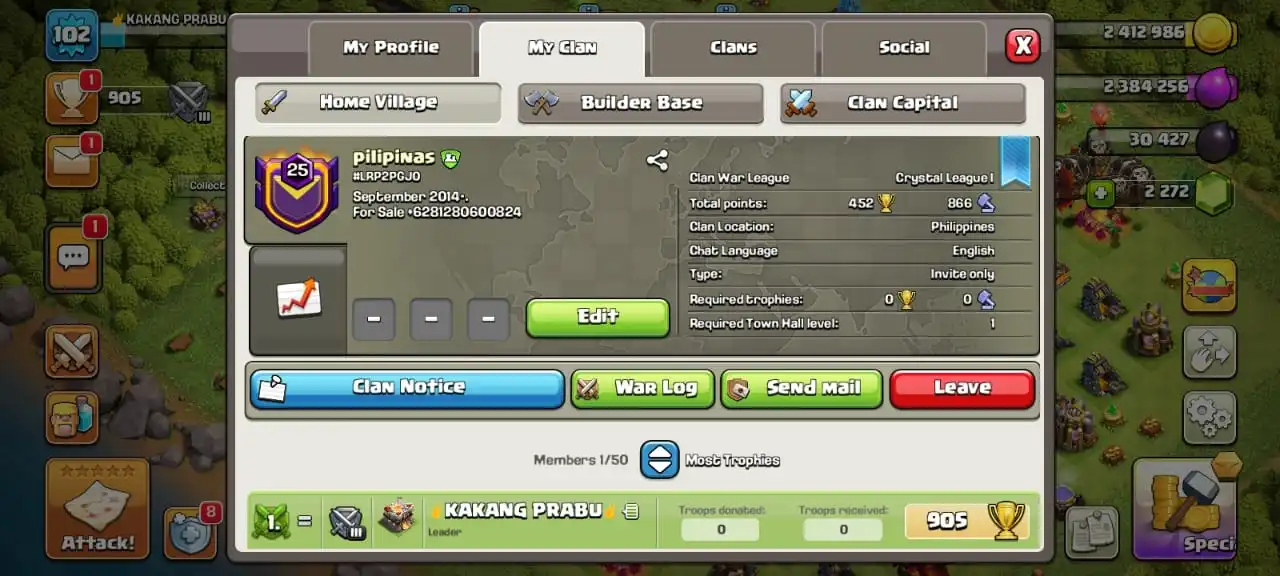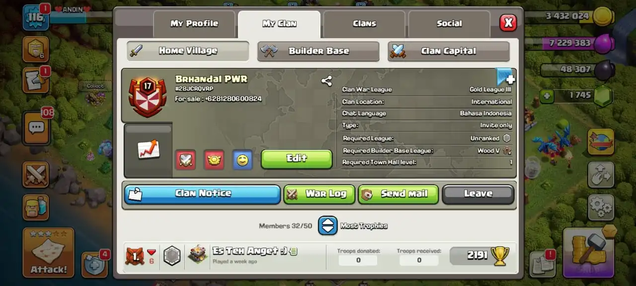 CLAN LV 17 | NICK NAME (BRHANDAL PWR)🔥 | WAR WIN 235⭐ - WAR LOSE 115 | CAPITAL LV 8 | WAR LEAGUE GOLD III