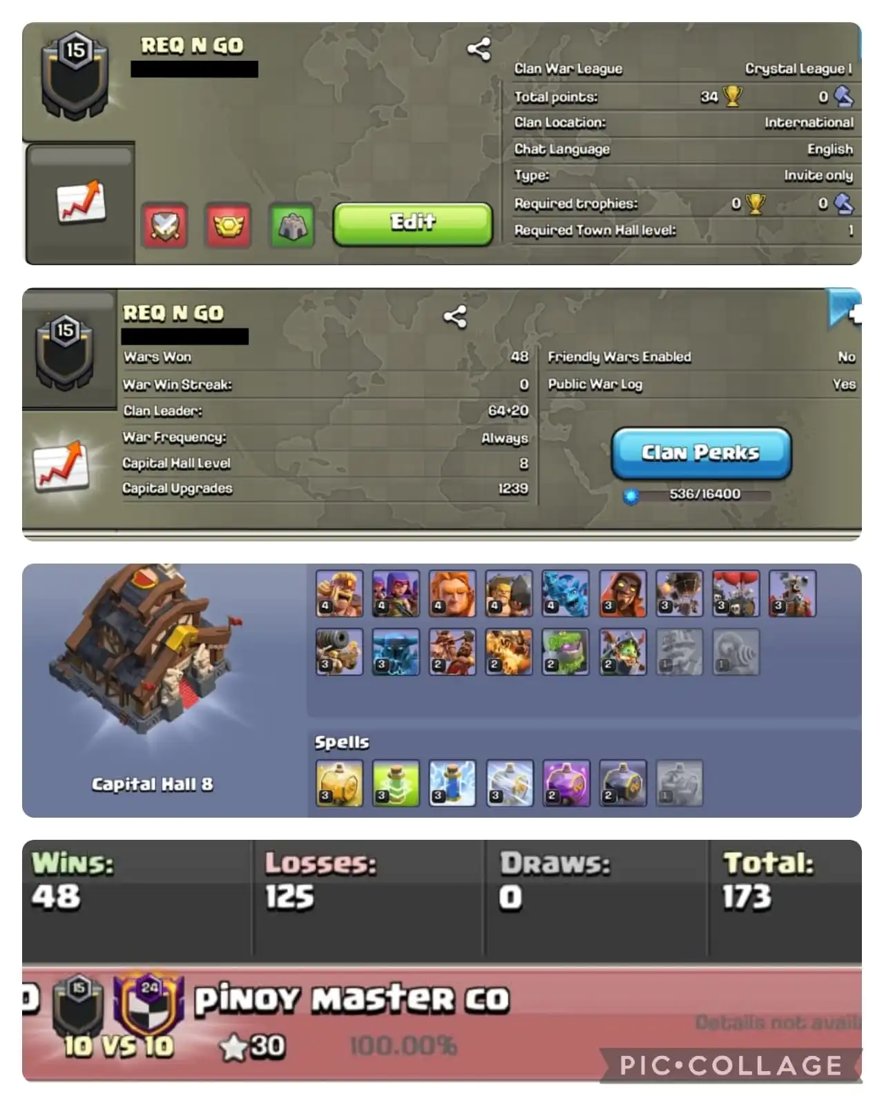 🔥NAME- REQ N GO | LVL 15🥵| 💥WARLOG W/L/D:48/125/0| CWL League: Crystal league 1| CC: ALMOST 9 !!💥
