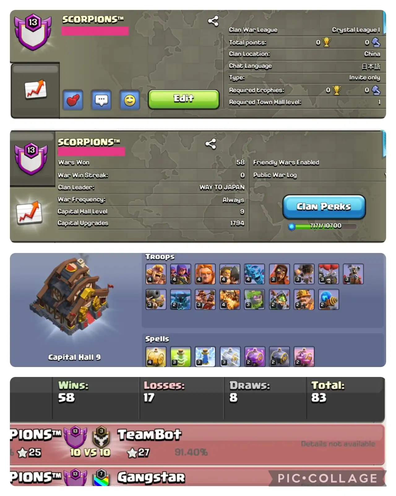 🔥 [CRYSTAL 1 + CC 9 ] 🏆NAME : SCORPIONS 🥶 LEVEL : 13.5 ⛈️ WARLOG W-L-D : 58-17-8 ⚡️
