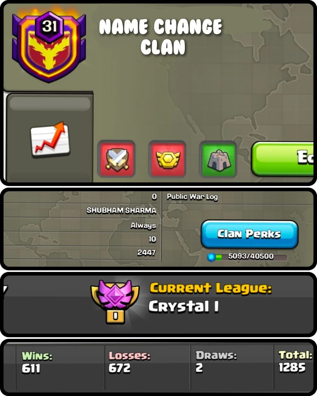 [CC: 10]CUSTOM NAME | NAME CHANGE CLAN | LVL 31.2 | WARLOG W-L-D:611-672-2 | CWL League: CRYSTAL 1 !!