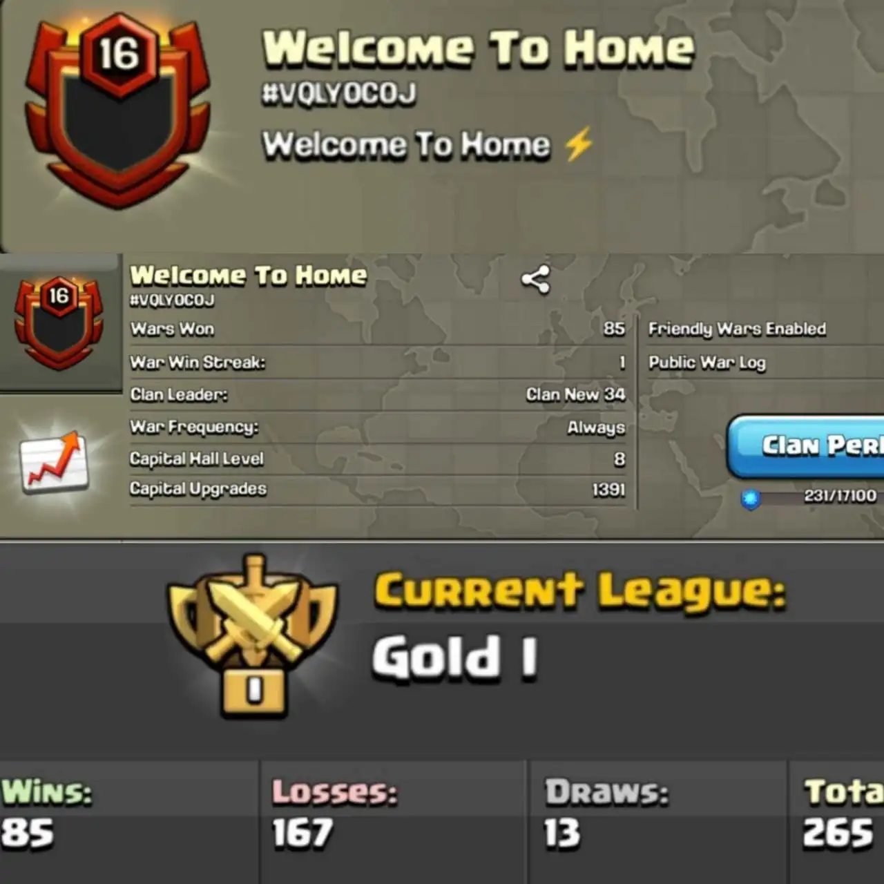 Level 16 clan || clan capital 8 || gold 1 || name - Welcome To Home