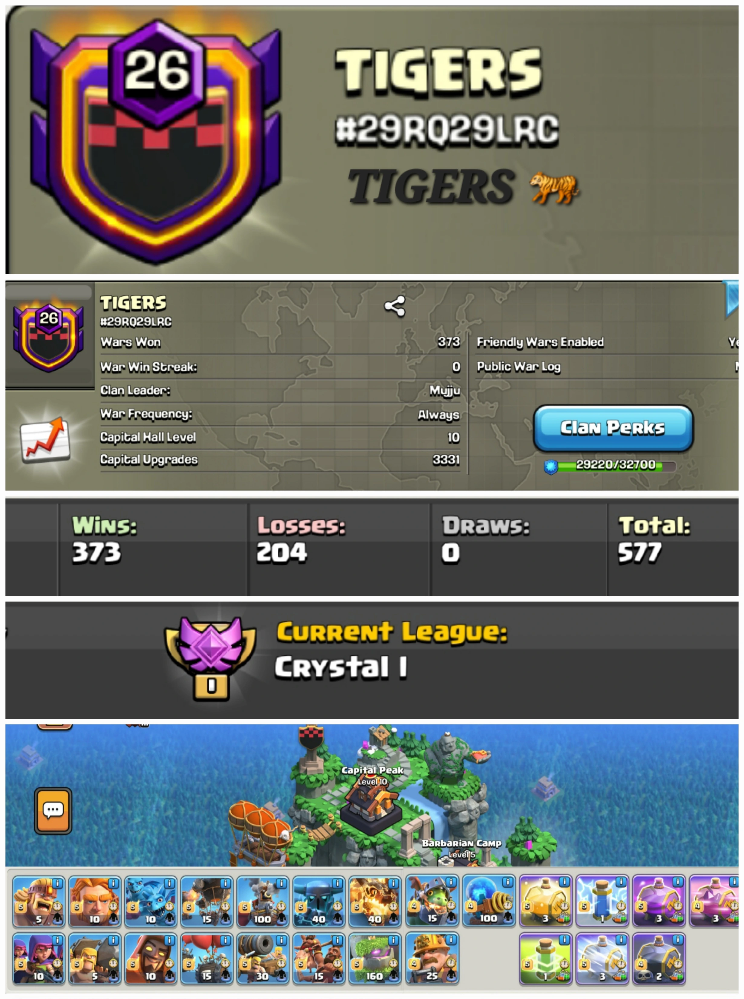 Level-31 🔴 Team Canada 🔴 Crystal 1 🔴 Clan Capital 10 🔴 808 : 663 Positive Log 🔴 Fast Delivery