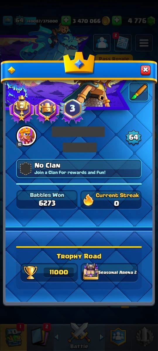 11 000 Trophies | XP Lvl 64❗️| 107 MAXED CARDS❗️| 45 ELITE LEVEL CARD ❤️🔥| 25 EVOLUTIONS📈 | 143 EMOTES | 100% safe account | instant delivery