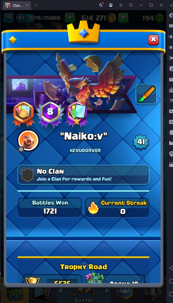 6526 TROPHY 🏆 41 LVL 💯 KT 13 👑 113 CARDS ♦️ 7 MAX CARDS 👑 0 ELITE CARDS 🔮 0 EVO 💯 EMOTE 40 🎭 #2VU009VQ9 ⸱ TAG ACCOUNT ♥️
