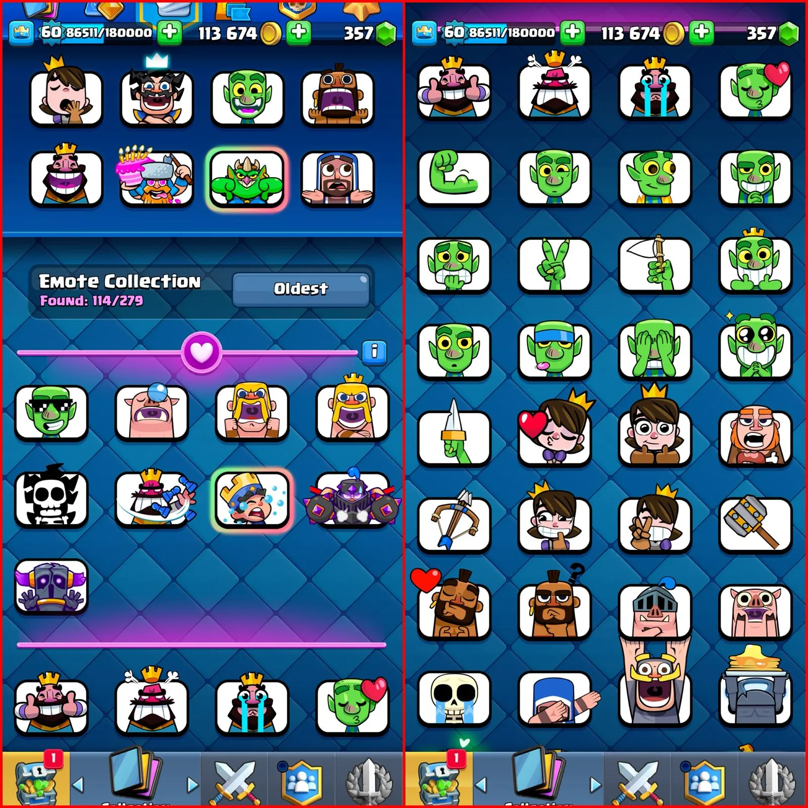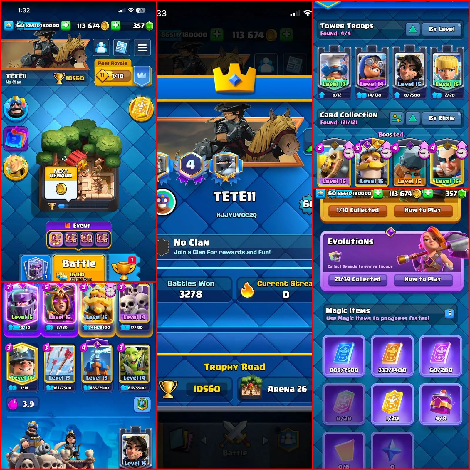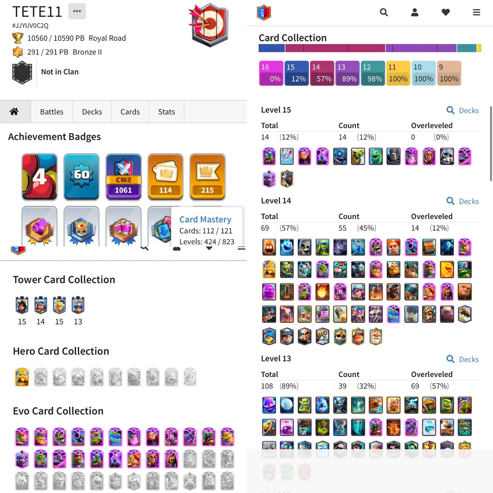 ✦ 69 Max Cards ✦ 21 Evolutions ✦ 14 Elites ✦ KT15 ✦ 10.5K Trophy ✦ 114 Emotes ✦ 10 Tower Skins ✦