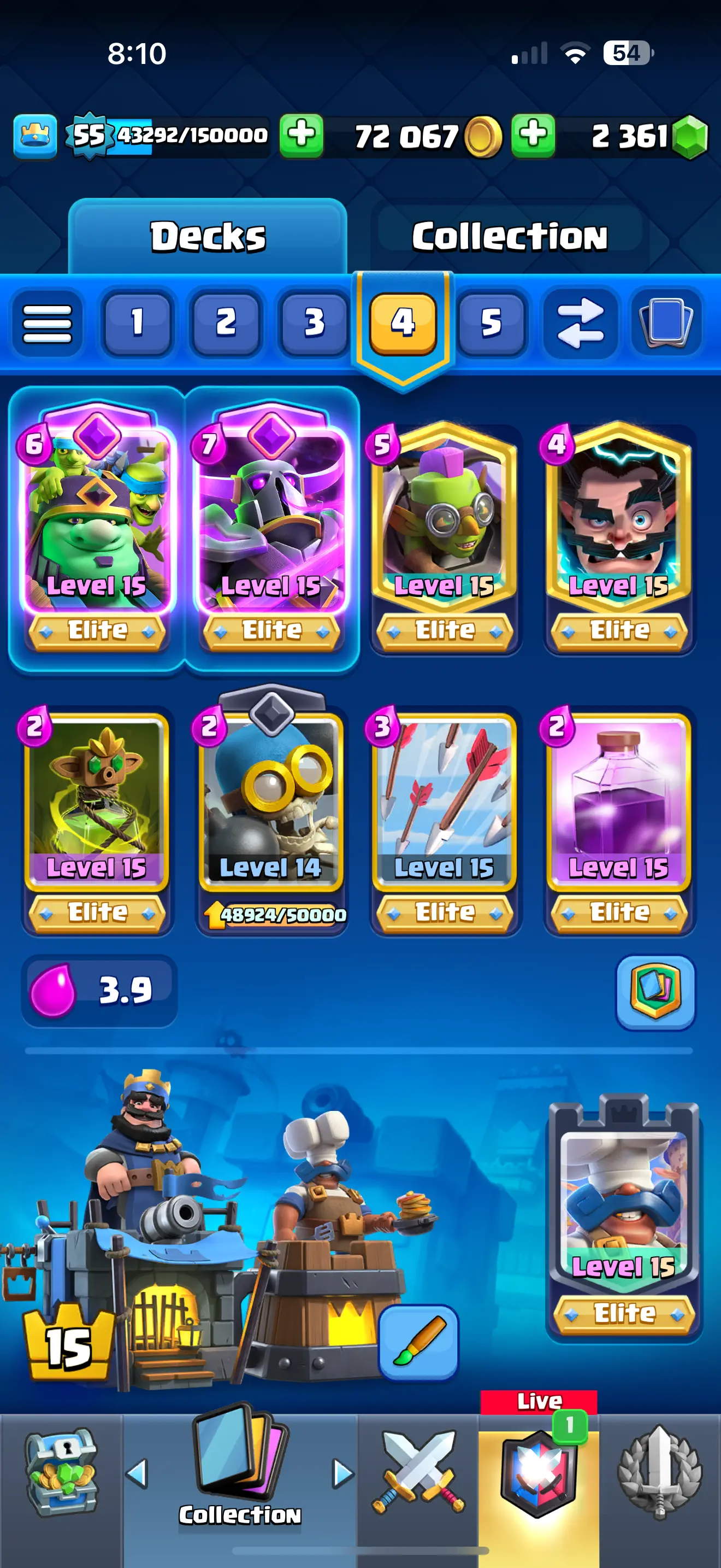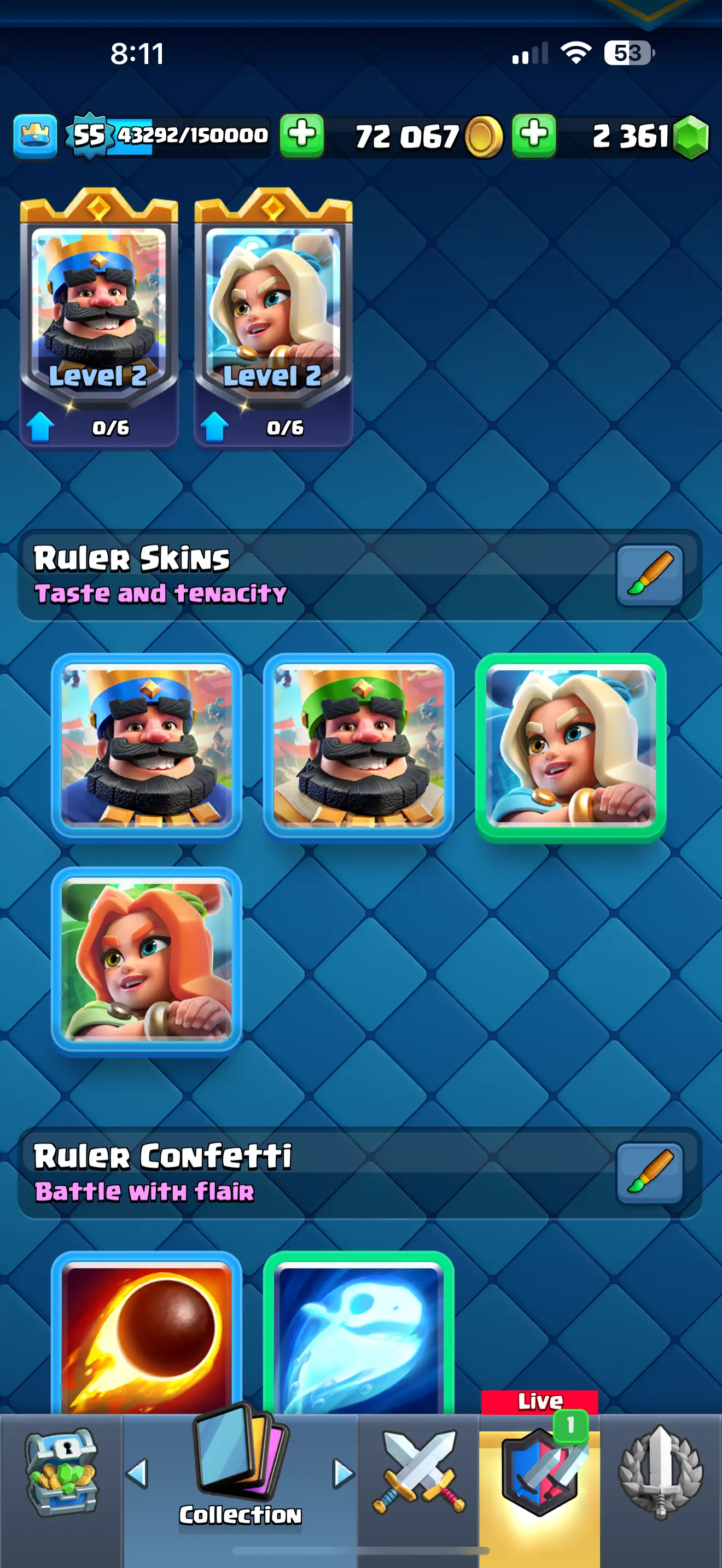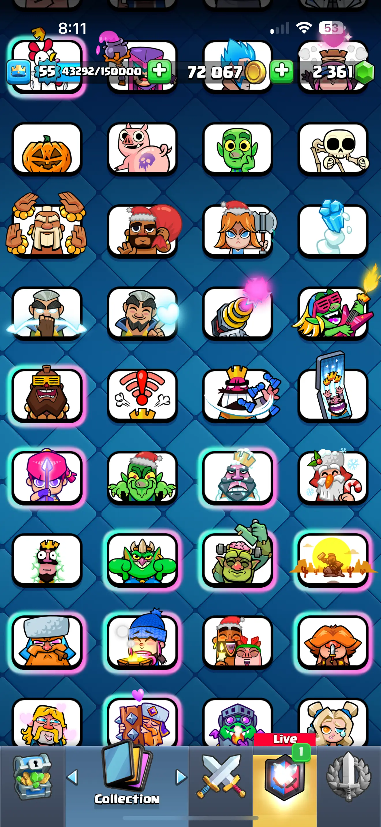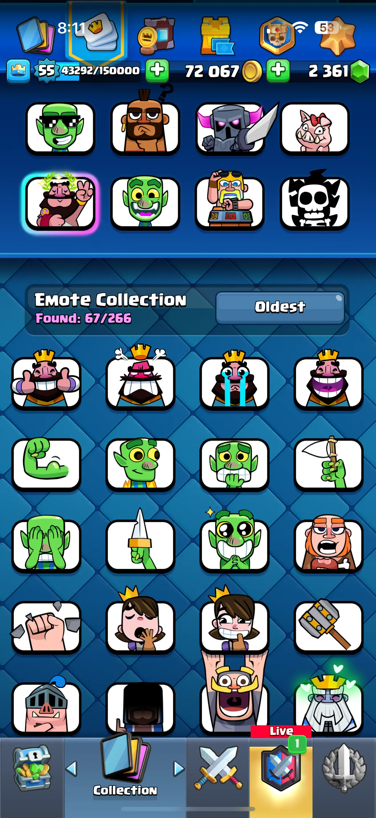 ❄️ [CHEAPST]✨ARENA 23 ♦️[RARE] EMPEROR KING EMOTE 😍9092 TROPHYS 🔥 9 EVO CARDS 💥10 ELITE CARDS 🔥 30 MAX CARDS 🔥 67 EMOTES 🌟XP (55)✨KT (15) ✨72067 GOLD 🥇 2361 GEMS 💎 ☘️6 KT SKINS ⭐ INSTANT DELIVERY 🚚