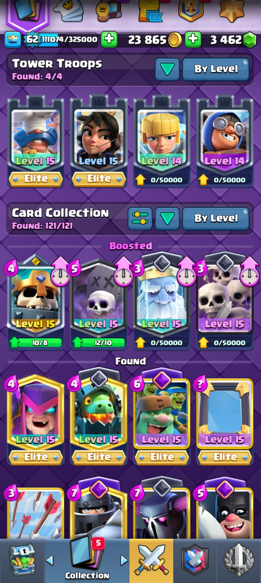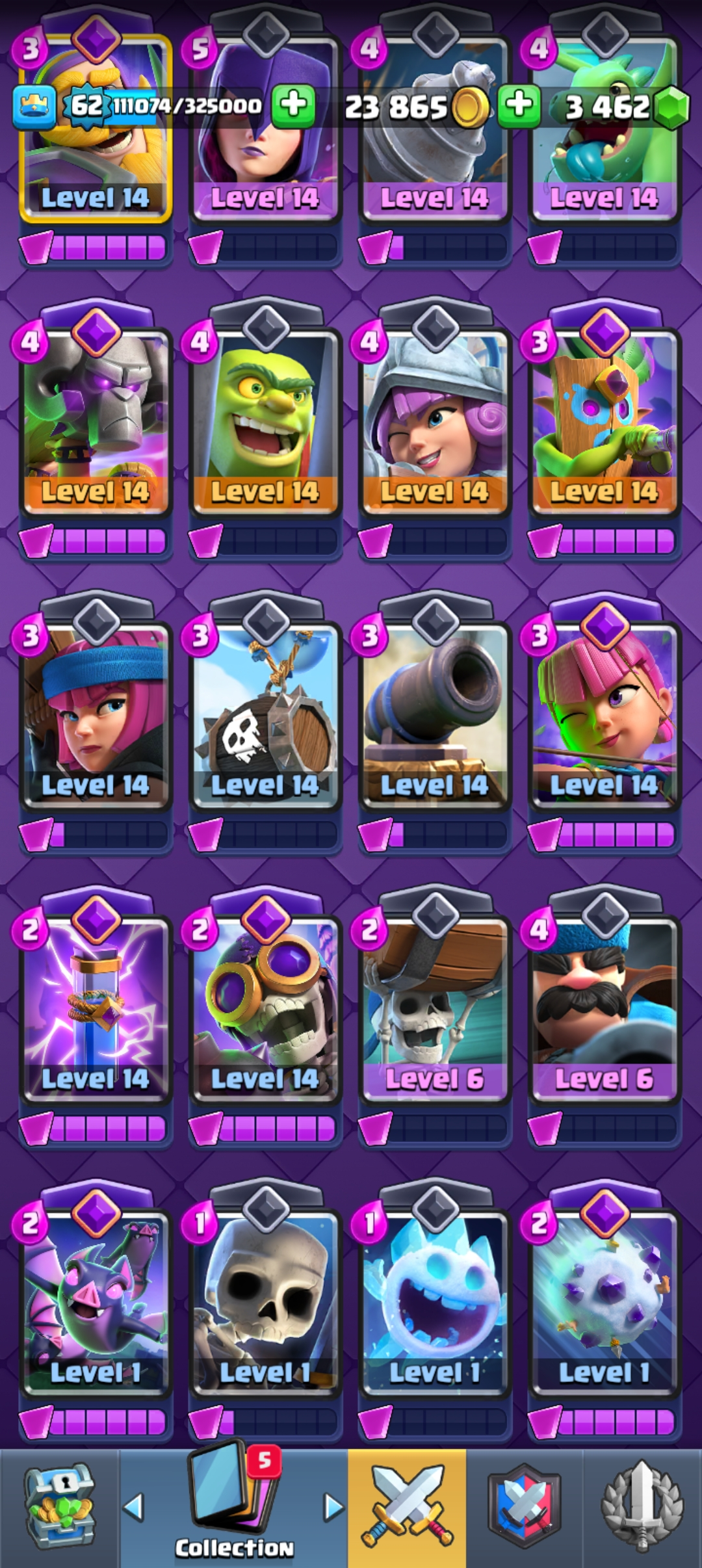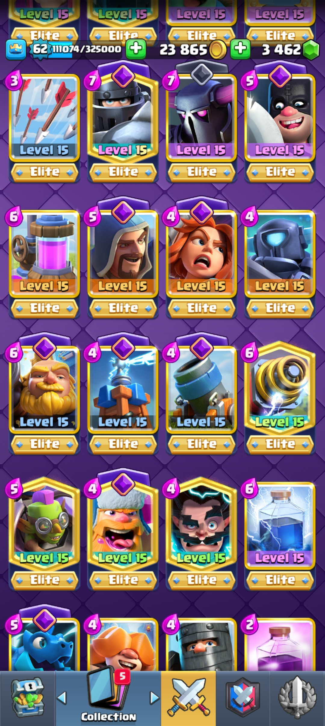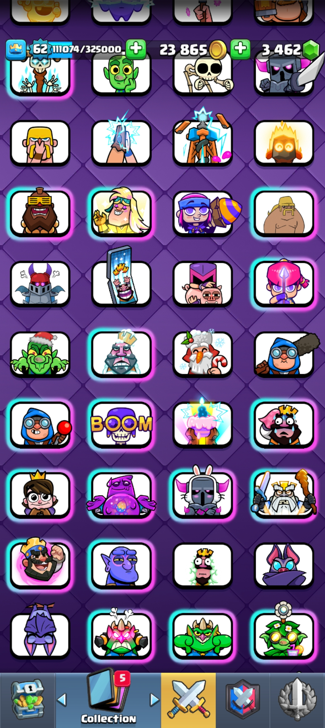 CR Lvl 62 ✨ 15000 Trophy ✨ KT 15 ✨ 36 Elite Cards ✨ 76 max cards ✨ 19 Evo Cards ✨ 124 Emotes ✨ 11 Tower skins