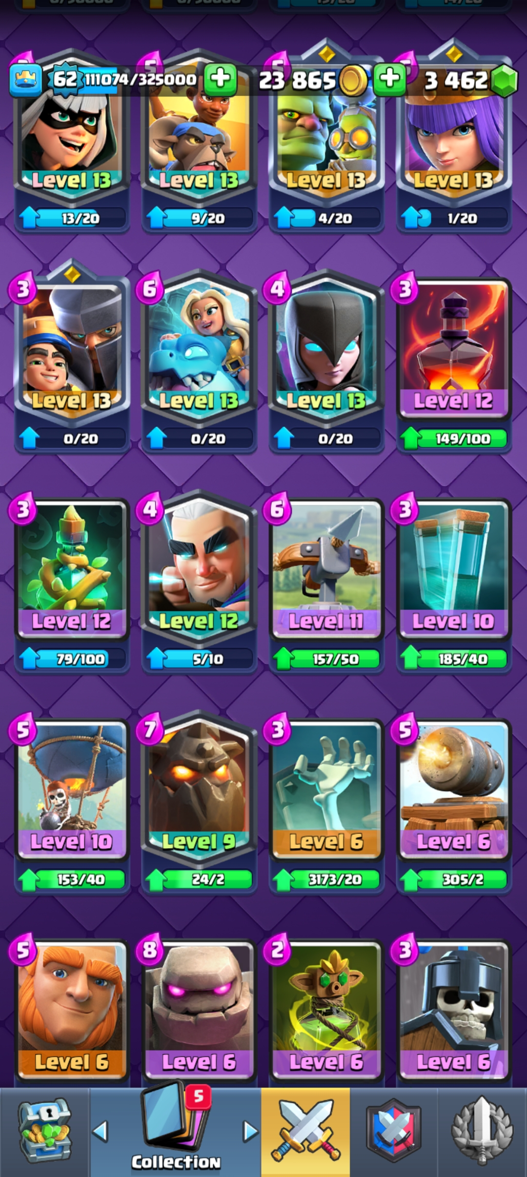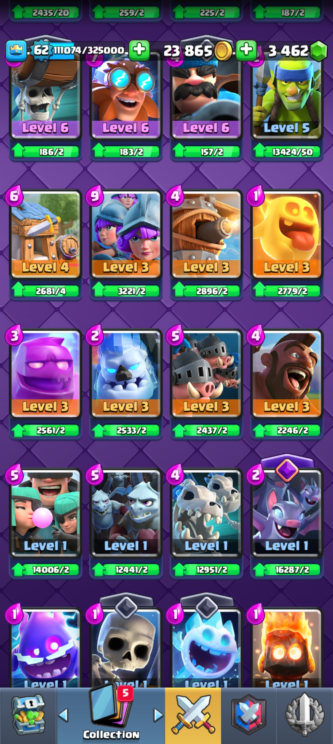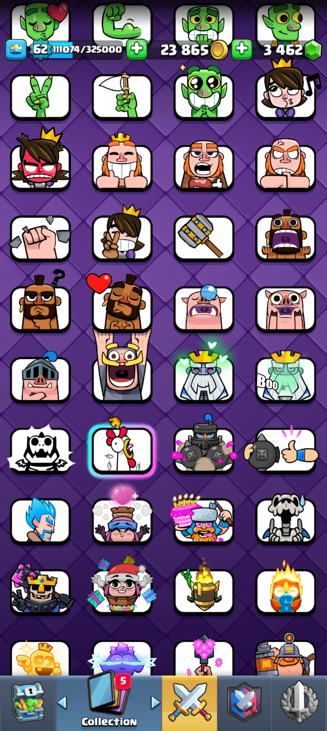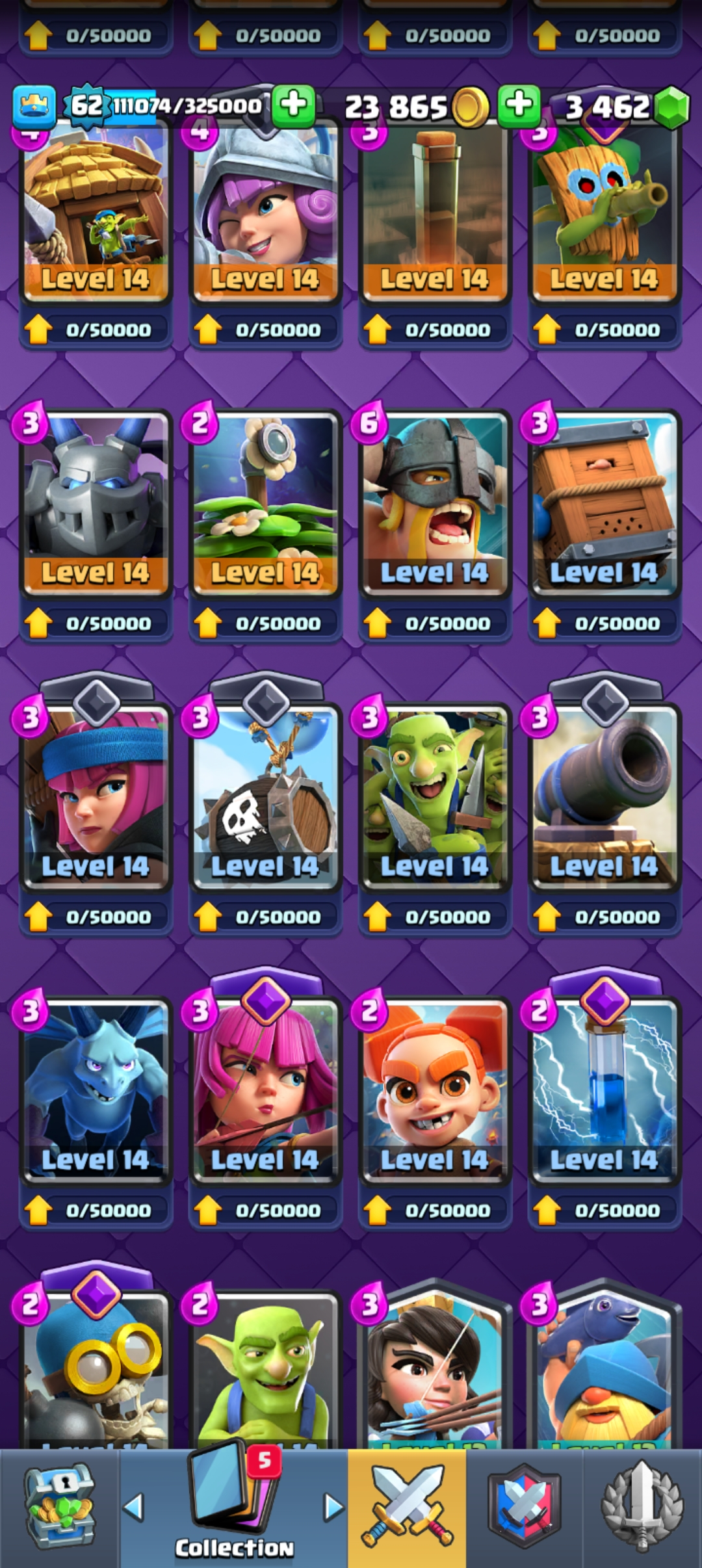 CR Lvl 62 ✨ 15000 Trophy ✨ KT 15 ✨ 36 Elite Cards ✨ 76 max cards ✨ 19 Evo Cards ✨ 124 Emotes ✨ 11 Tower skins